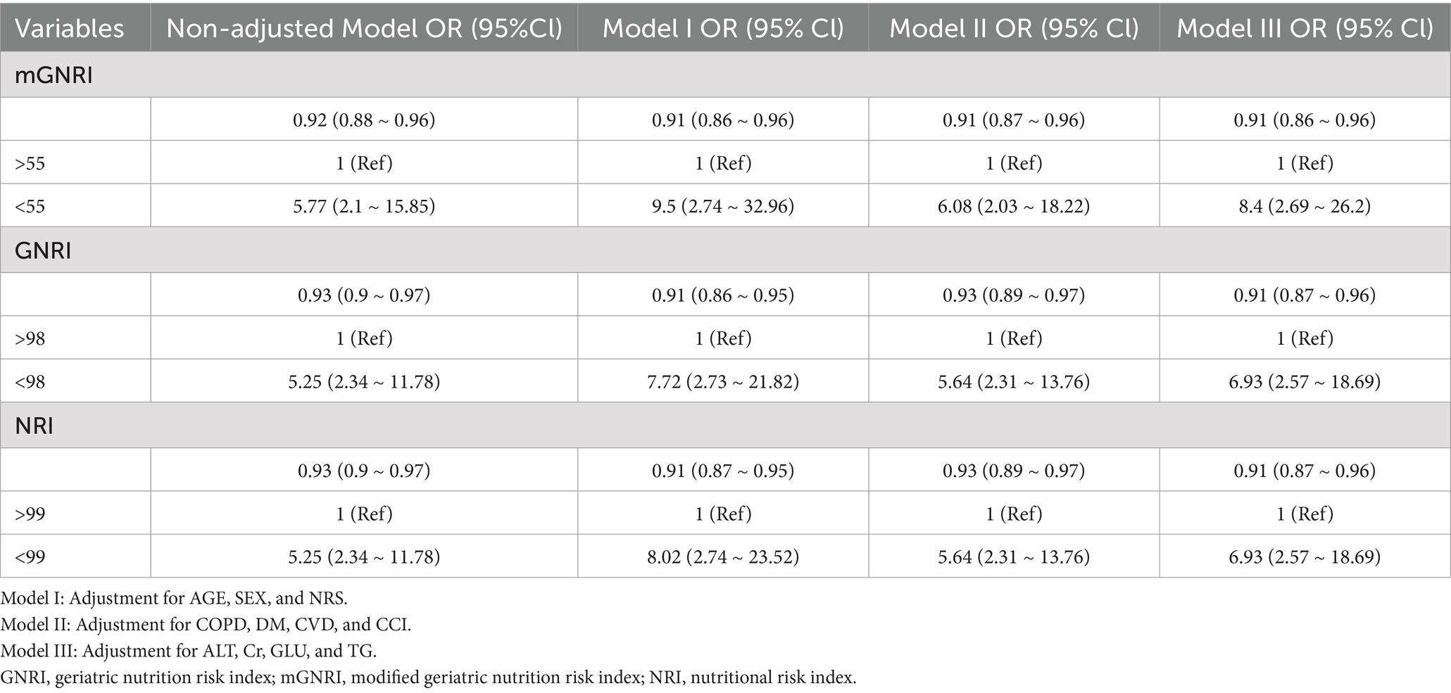 Logistic regression analyses demonstrated significant inverse relationships between all nutritional indices (mGNRI, GNRI, and NRI) and sarcopenia occurrence in both univariate and multivariate models. The results are summarized in Table 4.