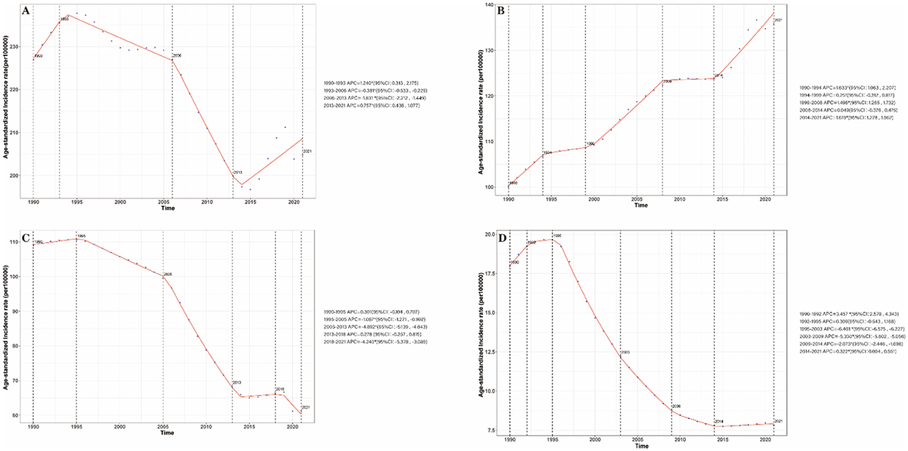 Figure 1. Annual percent change (APC) and trends in China stroke incidence from 1990 to 2021. (A) Stroke; (B) IS; (C) ICH; (D) SAH.