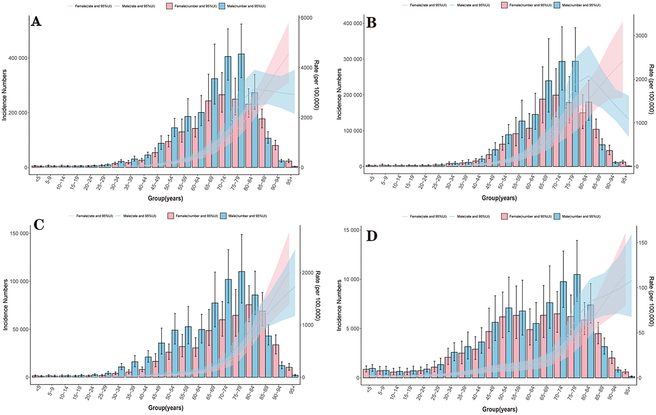 Bar charts A, B, C, and D compare incidence numbers and rates for age groups. Each chart differentiates data by gender, with pink and blue bars representing females and males, respectively. Shaded areas indicate 95% uncertainty intervals, with blue and red regions highlighting confidence bounds for each gender's data across different age ranges.