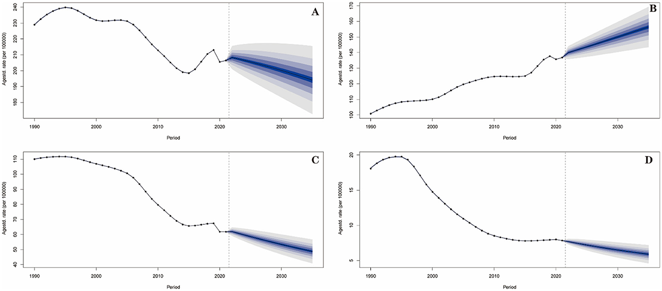 Figure 3. Prediction of incidence trend for stroke and its subtypes in China from 2022 to 2035. (A) Stroke; (B) IS; (C) ICH; (D) SAH.