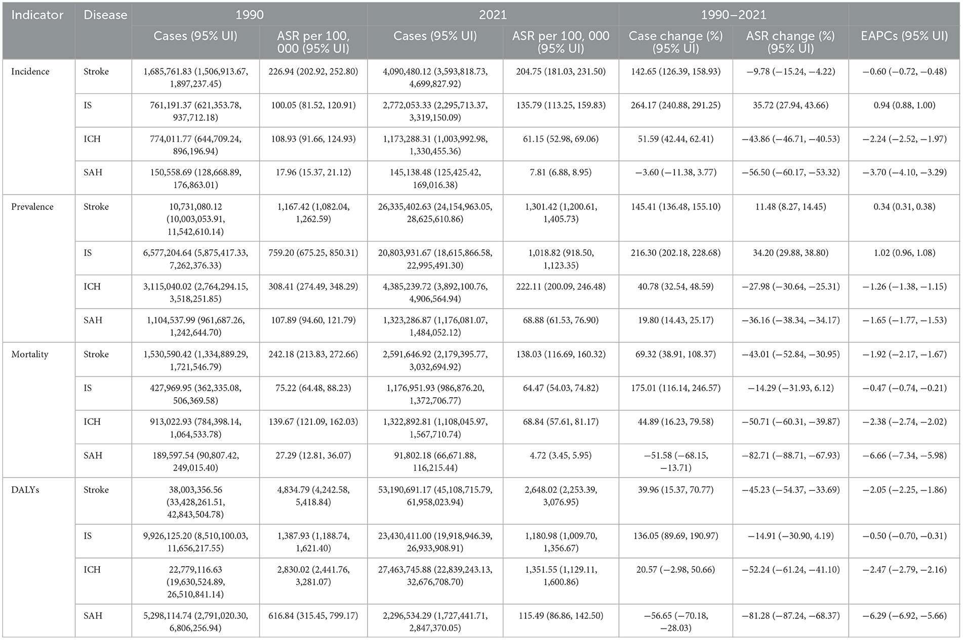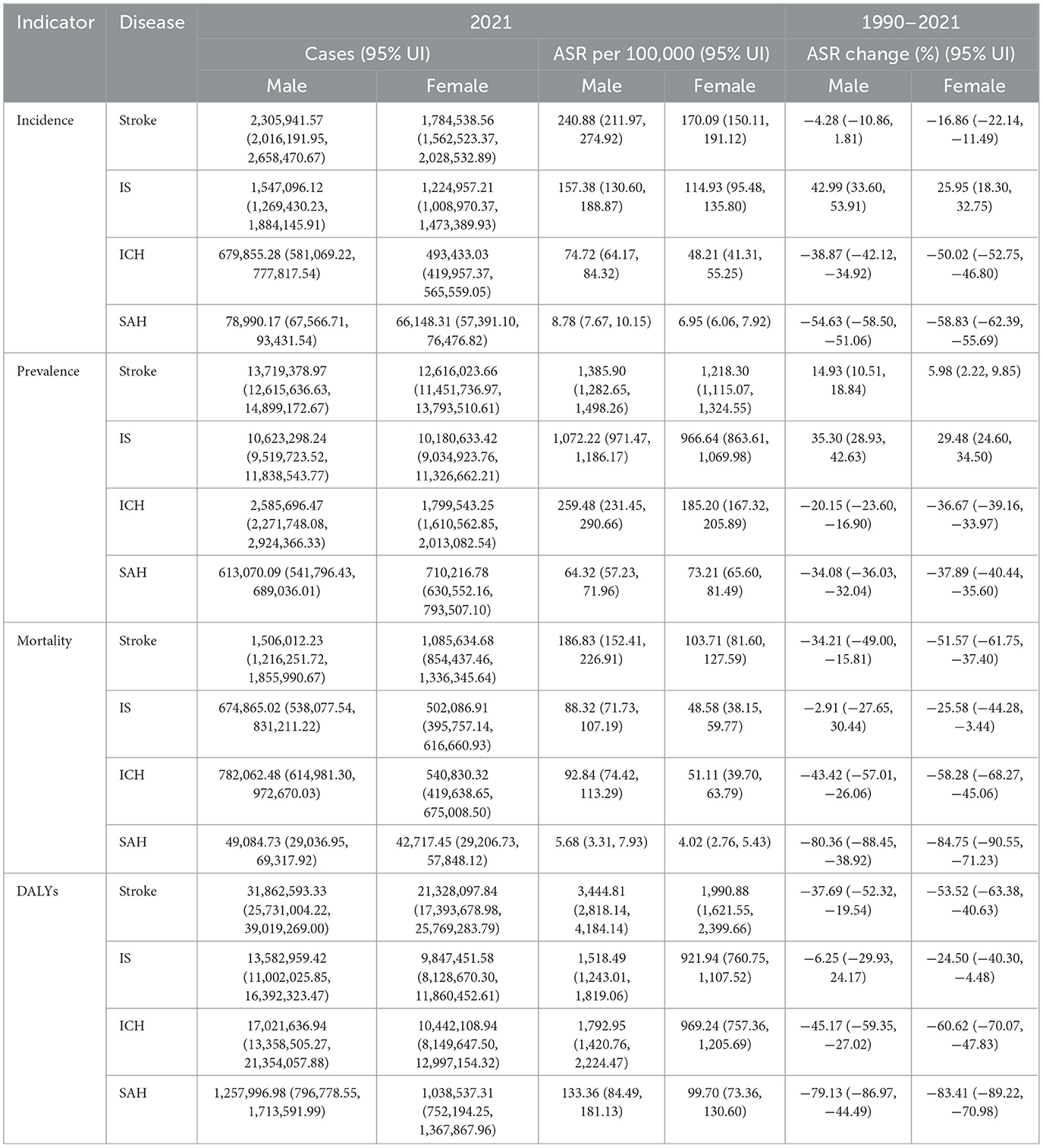 Table 2. Incidence, prevalence, mortality, DALYs of stroke, IS, ICH, SAH in China by gender from 1990 to 2021.