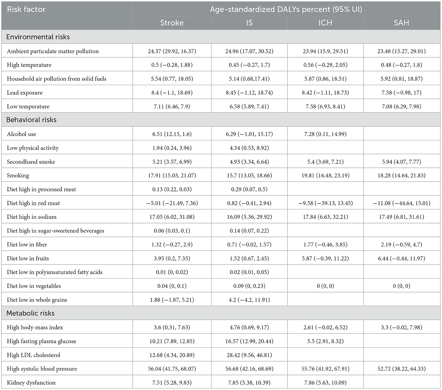 In 2021, 23 risk factors accounted for 45,467,333.89 (95% UI: 37,873,525.27–53,193,593.72) stroke-related DALYs in China. The top three risk factors for total stroke were (Table 3) high systolic blood pressure (PAF = 56.04%; 95% UI: 41.75–68.07), the dominant risk factor across all subtypes (IS: 56.68%; ICH: 55.76%; SAH: 52.72%); ambient particulate matter pollution (PAF = 24.37%; 95% UI: 16.37–29.92), with consistent contributions to IS (24.96%), ICH (23.94%), and SAH (23.48%); and smoking (PAF = 17.91%; 95% UI: 15.03–21.07), with higher contributions to ICH (19.81%) than IS (15.70%).
