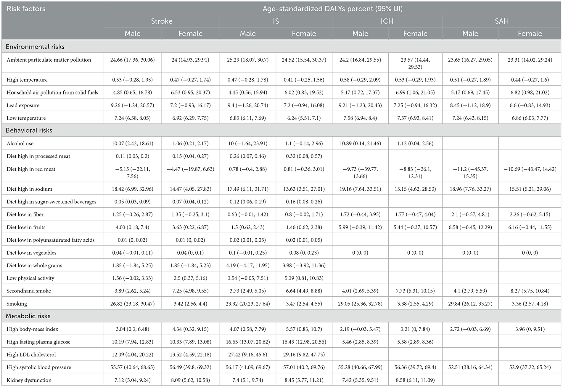Risk factor contributions differed significantly by gender (Table 4). For males, the top three risk factors for total stroke were high systolic blood pressure (55.57%; 95% UI: 40.64–68.65), smoking (26.82%; 95% UI: 23.18–30.47; 7.8 times higher than females), and ambient particulate matter pollution (24.66%; 95% UI: 17.36–30.06) (Table 4). Smoking also had the highest PAF for male ICH (29.05%) and SAH (29.84%). For females, the top three risk factors were high systolic blood pressure (56.49%; 95% UI: 39.80–69.32), ambient particulate matter pollution (24.00%; 95% UI: 14.93–29.91), and diet high in sodium (14.47%; 95% UI: 4.05–27.83; 1.3 times higher than males) (Table 4). Females also had higher PAF for secondhand smoke (7.25% vs. male 3.89%) and household air pollution (6.53% vs. male 4.85%).