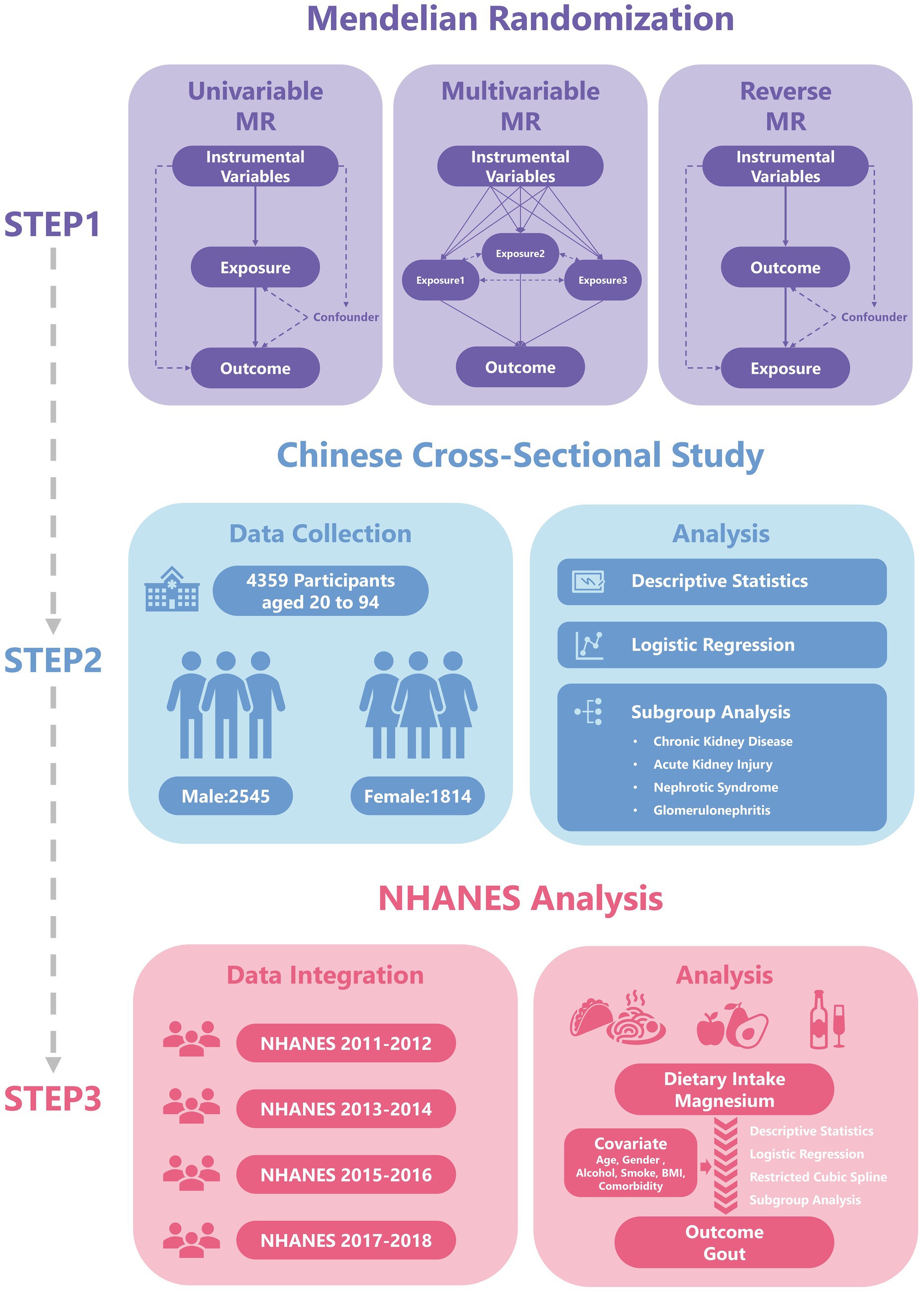 Herein, we not only conducted MR analysis on European cohort data but also integrated Chinese clinical data and U.S. NHANES data, thereby enhancing the generalizability of the findings. However, several limitations should be acknowledged, as follows. (1) Lack of assessment of magnesium storage status: the MR methods and clinical data used in this study reflected only circulating magnesium levels but not storage status. (2) Inclusion bias of study participants: although the sample size exceeded the epidemiological calculation thresholds, the underrepresentation of female patients with gout might potentially introduce bias. Additionally, because all collected clinical data came from patients with kidney disease, a control group of healthy individuals was lacking. Moreover, because of data collection and organization constraints, the temporal baseline in the Chinese clinical data differed from that in NHANES. (3) Observational analysis error: Dietary magnesium intake data are derived from the 24-h recall method, and inherent measurement errors in this method may affect the accuracy of the assessment. In the NHANES data, gout outcomes rely on patient self-reporting, and such misclassification may introduce bias into the observed associations. Residual confounding is likely present in Chinese clinical data, such as drug use (diuretics, allopurinol, colchicine, steroids, PPIs, etc.), socioeconomic status, and total energy and protein intake. (4) Multiple Testing Issue: To comprehensively explore potential associations between exposure to 15 nutrients and gout, this study did not perform multiple testing correction during the preliminary analysis phase. While this strategy aids in identifying potential factors, it correspondingly increases the risk of false positive results. (5) Lack of intervention experiments: a prior study has reported a positive correlation between magnesium deficiency and gout risk in U.S. adults, but dietary magnesium intake did not modify this association (24). In Model 3 of NHANES in this study, dietary magnesium intake had a potential protective effect on gout (p = 0.049), which should be interpreted with caution. Therefore, the efficacy of magnesium supplementation requires further validation through randomized controlled trials. (6) Lack of mechanistic validation: This study relied on a literature-based synthesis to formulate hypotheses regarding the potential mechanisms of magnesium in gout pathophysiology. However, the specific mechanisms will require further experimental verification. In summary, despite this study’s advancements in elucidating the relationship between magnesium and gout, further exploration remains necessary to address existing limitations. Future research should prioritize expanding the study sample, incorporating healthy individuals, and providing more robust experimental evidence to strengthen the findings.