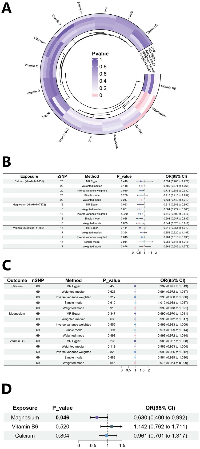 Figure 2. Mendelian randomization analysis results. (A) Heat map of univariate MR analysis for 15 micronutrients. (B) Forest plot of MR analysis for calcium, magnesium and Vitamin B6. (C) Forest plot of reverse MR analysis. (D) Forest plot of multivariate MR analysis.