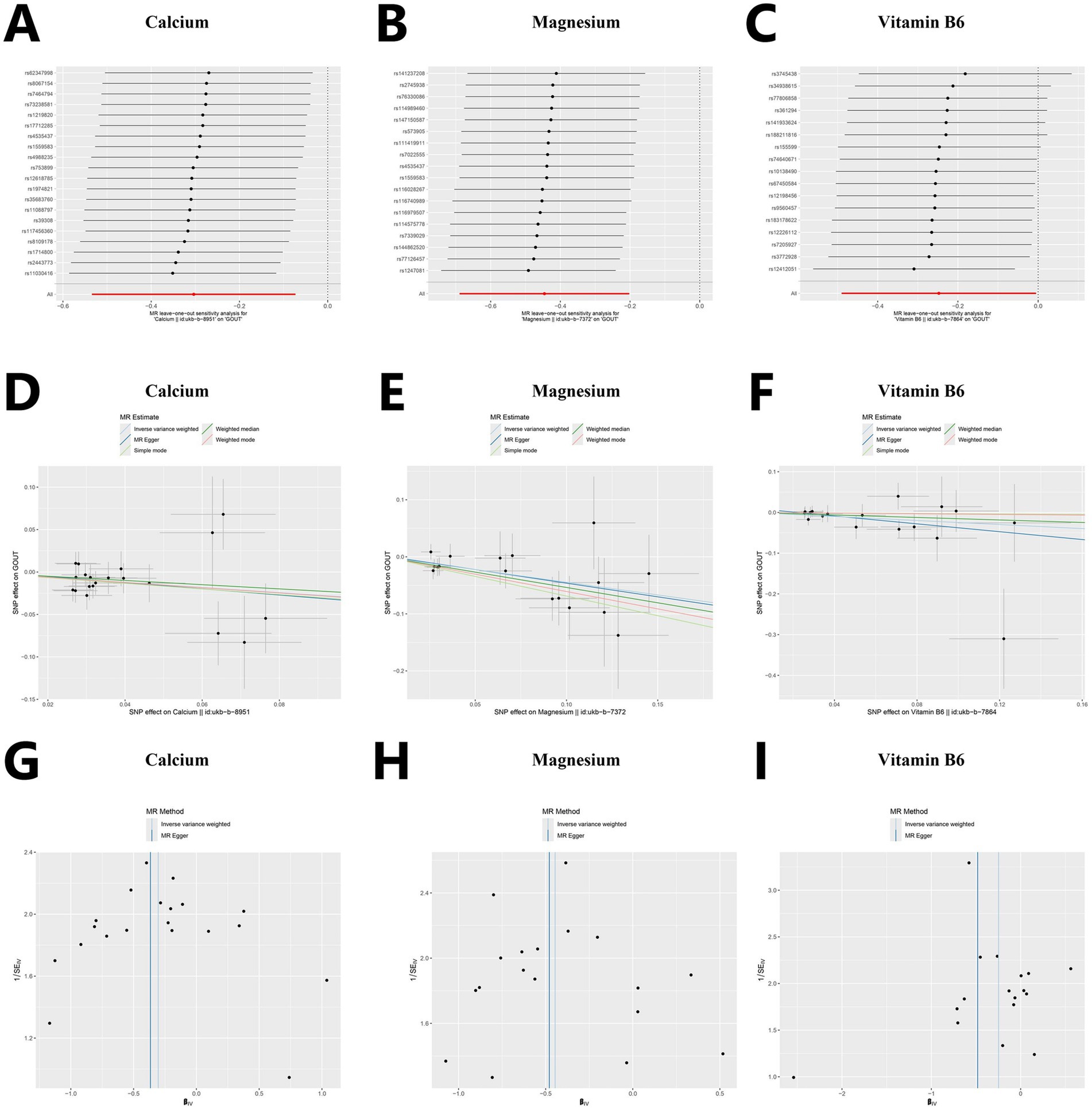 The results of the sensitivity analysis of Calcium, magnesium, and vitamin B6 are as follows. According to the sensitivity analysis with the leave-one-out method (Figures 3A–C), the overall results did not significantly change after the exclusion of instrumental variables one by one. A scatter plot visualizing the relationships between exposures and the outcome (Figures 3D–F). The roughly symmetrical funnel plot (Figures 3G–I) indicated no significant bias and supported the reliability of the results. In the heterogeneity test, no significant difference was observed (p > 0.05, I2 = 0.00%), and the results of the horizontal pleiotropy analysis were also not statistically significant (p > 0.05), thus further indicating the robustness of the results of this study. The results of other micronutrients are detailed in Supplementary Tables 3–5 and Supplementary Figures 2-4.