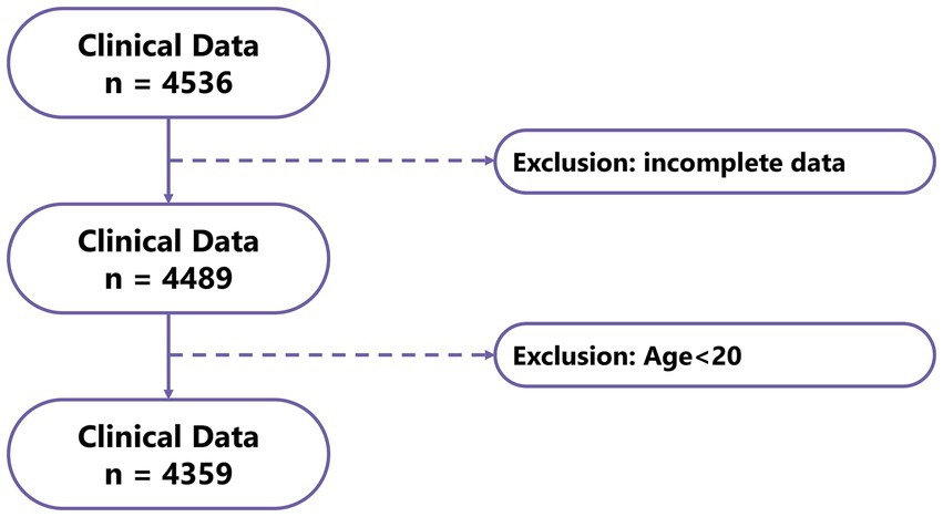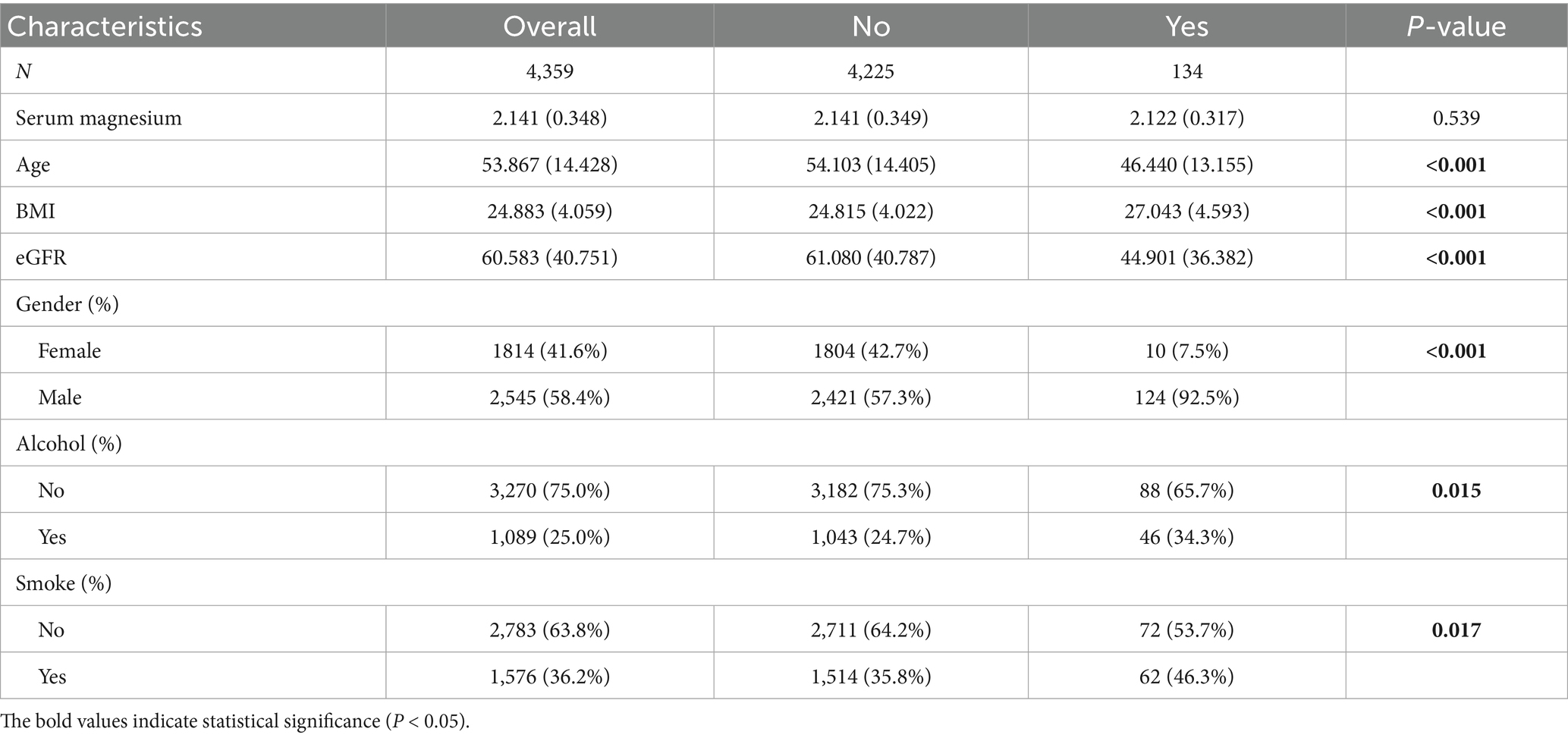 The research sample comprised patients who received inpatient treatment in a nephrology department (January 1, 2023 – December 31, 2023). According to prevailing international guidelines, applying the 2015 American College of Rheumatology/European League Against Rheumatism gout classification criteria (15), whereby a score of ≥ 8 points indicates definite gout, or by confirming a documented prior history of gout established. Basic data collection was performed with a dual independent input system, including the following core variables: demographic characteristics (age and sex); laboratory test findings (serum magnesium concentration in mg/dL, reference ranges: 1.63–2.80 mg/dL); diagnostic information (diagnosed gout); health related behaviors [smoking history, alcohol consumption history, and body mass index (BMI)] and other clinical diagnoses (chronic kidney disease [CKD], acute kidney injury [AKI], nephrotic syndrome [NS], and glomerulonephritis [GN]). Since all clinical data in this study were derived from nephrology patients. We estimated glomerular filtration rate (eGFR, mL/min/1.73 m2) using the Chronic Kidney Disease Epidemiology Collaboration (CKD-EPI) equation (16) and incorporated eGFR into the study. The data processing flow strictly followed clinical research standards, and data cleaning and analysis were conducted in R.