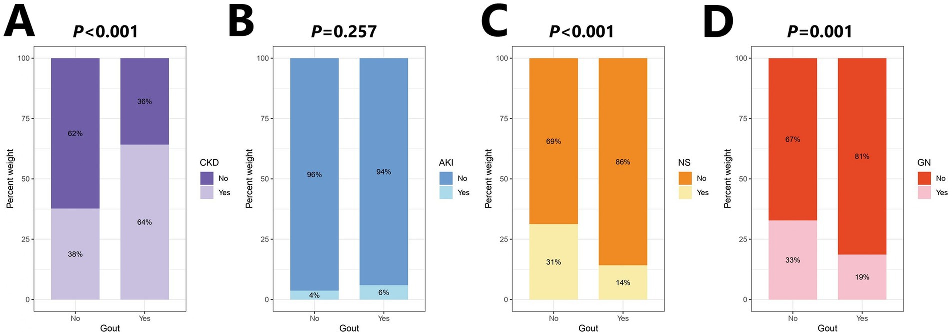 Figure 5. Percentage stacked bar chart of kidney disease distribution. (A) Chronic kidney disease (CKD). (B) Acute kidney injury (AKI). (C) Nephrotic syndrome (NS). (D) Glomerular nephritis (GN).