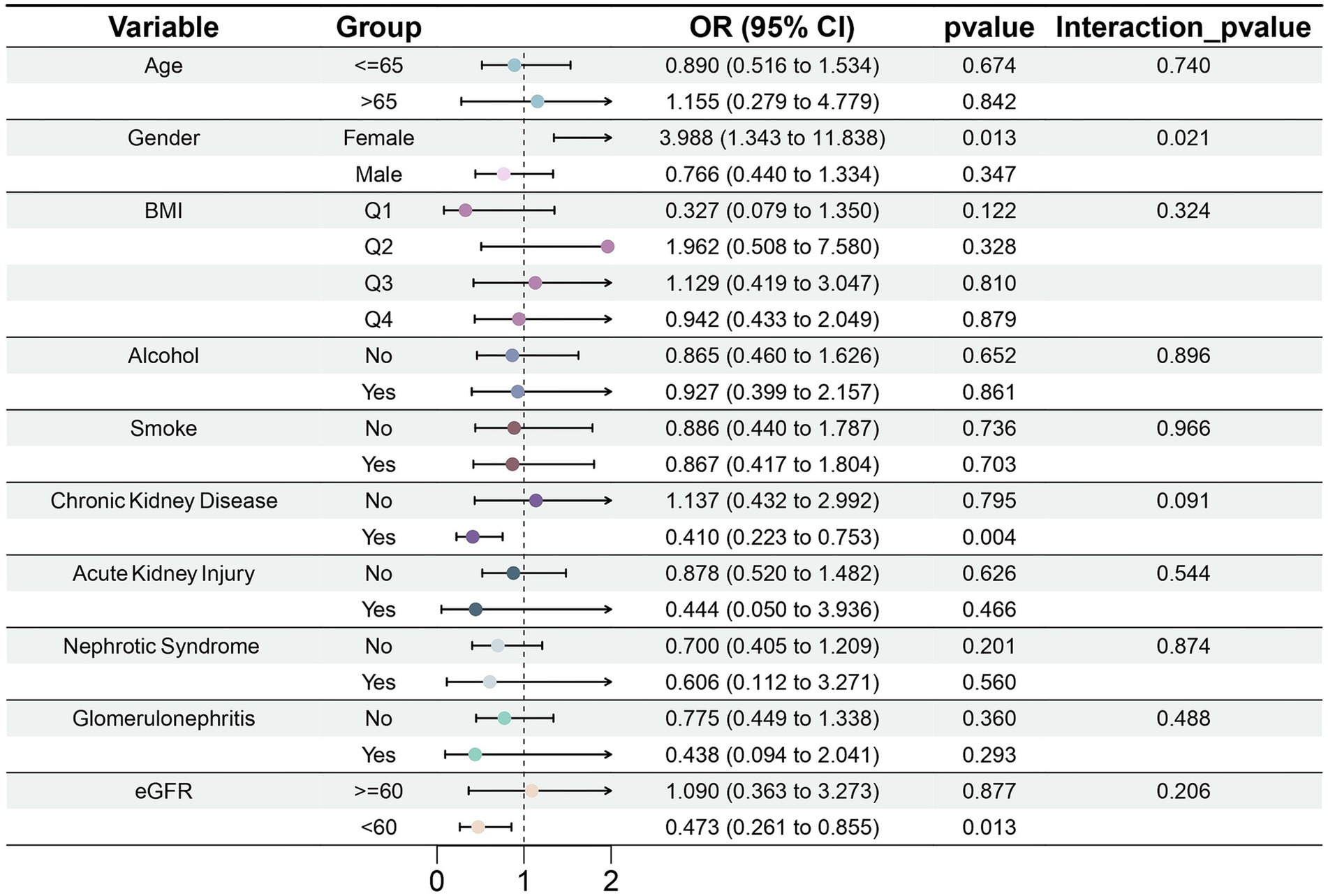 In the CKD subgroup, serum magnesium concentration was significantly negatively correlated with gout risk (OR = 0.410, 95% CI: 0.223–0.753, p = 0.004) (Figure 6). This outcome was consistent with eGFR. We found that in the subgroup with eGFR <60 mL/min/1.73 m2, magnesium may also be a protective factor against gout (OR = 0.473, 95% CI: 0.261–0.855, p = 0.013). However, among female participants, greater serum magnesium concentrations were associated with a higher risk of gout (OR = 3.998, 95% CI: 1.343–11.838, p = 0.013). It is critical to interpret this finding with extreme caution due to the very limited number of female gout cases in our study (Control: 1804; Case: 10), which considerably undermines the statistical reliability. This caution is further warranted by the significant interaction effect observed between sex and serum magnesium (p for interaction = 0.021). Moreover, analysis conducted exclusively in males, which comprised the majority of cases, showed no significant association (OR = 0.766, 95% CI: 0.440–1.334, p = 0.347). Collectively, given the instability of the female subgroup estimate and the null finding in males. The result should currently be considered exploratory, pending validation in large-scale, prospective cohorts.