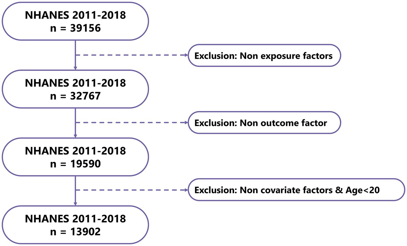 We used 24-h dietary recall interviews from the NHANES database to calculate the intake of trace elements. The first interview was conducted at the Mobile Examination Center, and the second interview was conducted via telephone follow-up after 3–10 days. On the basis of the results of these two interviews, we calculated the average of the two intake levels. If data from one interview were missing, we used the results from the other interview. The outcome was determined according to participants’ self-reported history of gout in the NHANES database. Finally, the mice package in R was used to filter and fill in the gaps in the NHANES dataset.