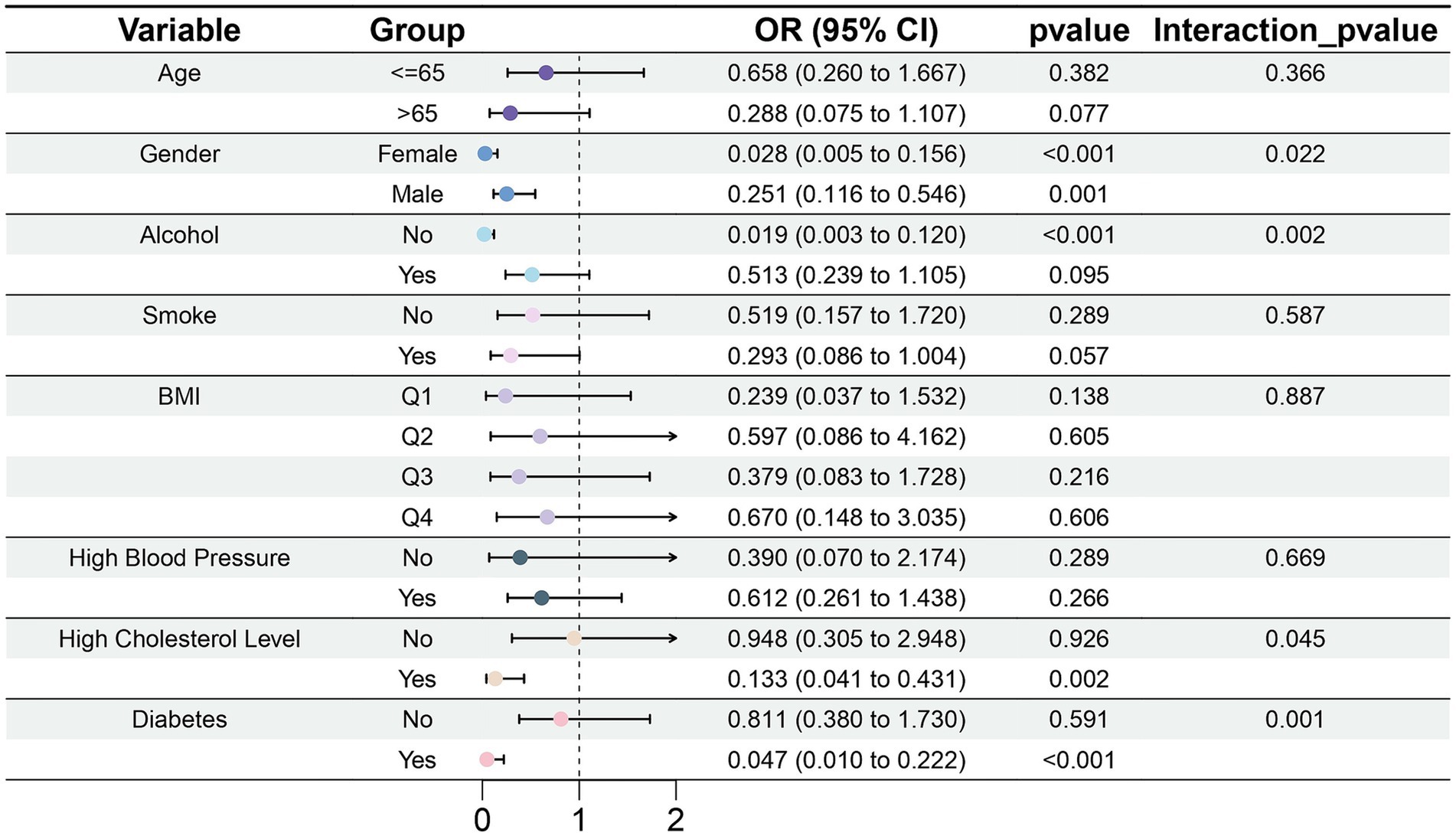 Magnesium intake did not significantly differ among groups stratified by age, smoking status, and BMI (Figure 8). Among participants who did not drink alcohol, magnesium intake was associated with diminished risk of gout (OR = 0.019, 95% CI: 0.003–0.120, p < 0.001). In the subgroup with high cholesterol level (OR = 0.133, 95% CI: 0.041–0.431, p = 0.002) and diabetes (OR = 0.047, 95% CI: 0.010–0.222, p < 0.001), the association between magnesium intake and gout was statistically significant. Moreover, we observed interactions of sex, alcohol consumption, high cholesterol level, and diabetes with magnesium intake (p < 0.05).