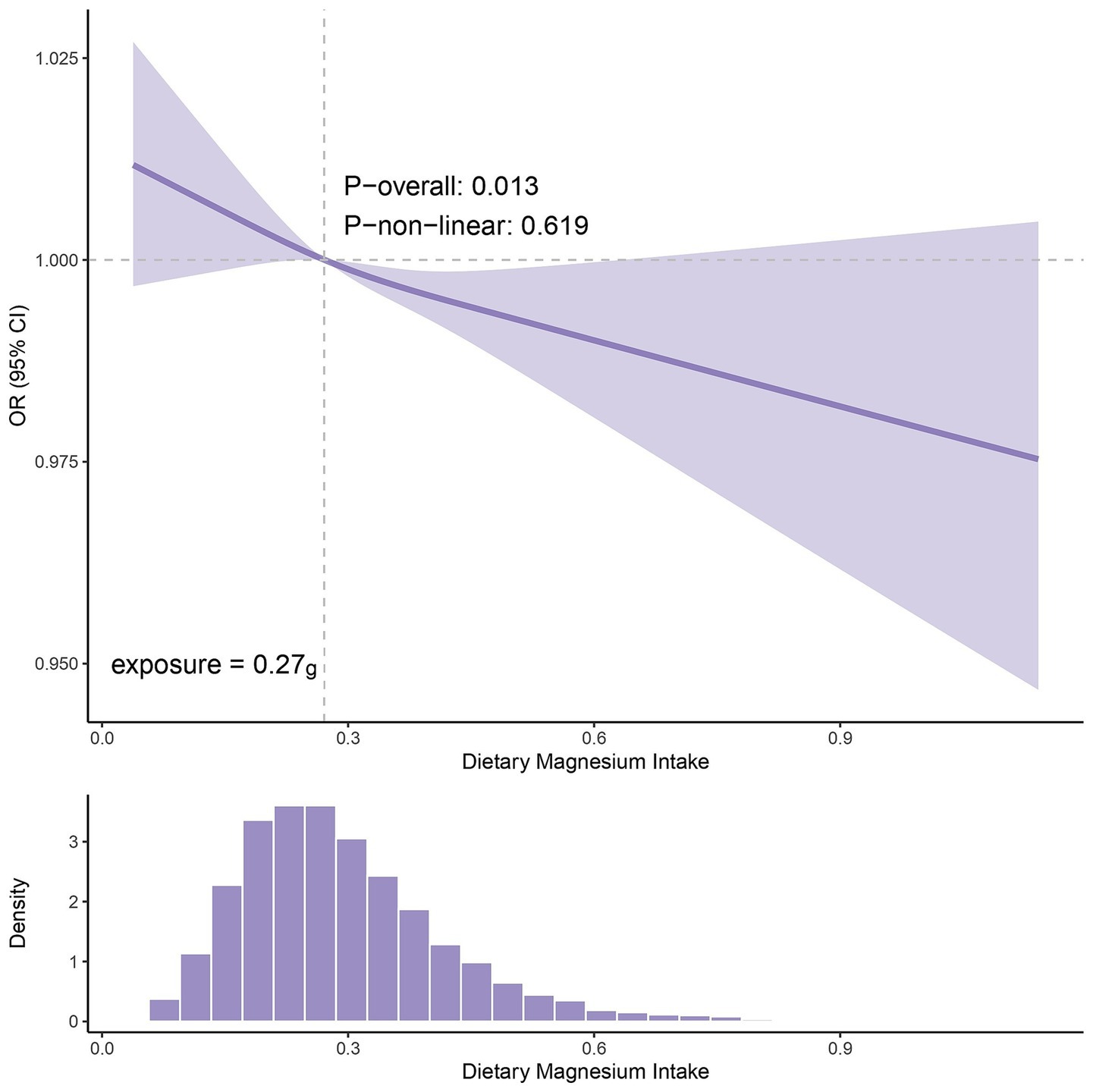 According to the Chinese dietary reference intakes, the recommended daily magnesium intake is 330 mg for adults, and an additional 40 mg is required for pregnant and lactating people. These values closely align with the U.S. recommended dietary allowance of 310–420 mg/day (45). Currently, the dietary magnesium intake in both Western and Eastern countries is substantially below recommended daily levels and indicates widespread deficiency (46, 47). Therefore, increased dietary intake of magnesium-rich foods, primarily leafy green vegetables (e.g., spinach), fruits (e.g., bananas), whole grains (e.g., brown rice and oats), and nuts (e.g., cashews and almonds), is recommended (48). Furthermore, appropriate cooking methods should be used to minimize magnesium loss during food preparation (46). Additionally, under physician supervision, magnesium supplementation (e.g., magnesium sulfate or magnesium chloride) might be considered to address potential deficiencies (49, 50). From a translational perspective, this study, based on NHANES data, revealed a significant association between a dietary magnesium intake exceeding 0.27 g and diminished gout risk (OR <1), thus providing empirical support for defining intervention thresholds. Our findings suggested that increasing dietary magnesium intake might be associated with a reduced risk of gout. This finding requires further validation through subsequent clinical trials or prospective cohort studies.