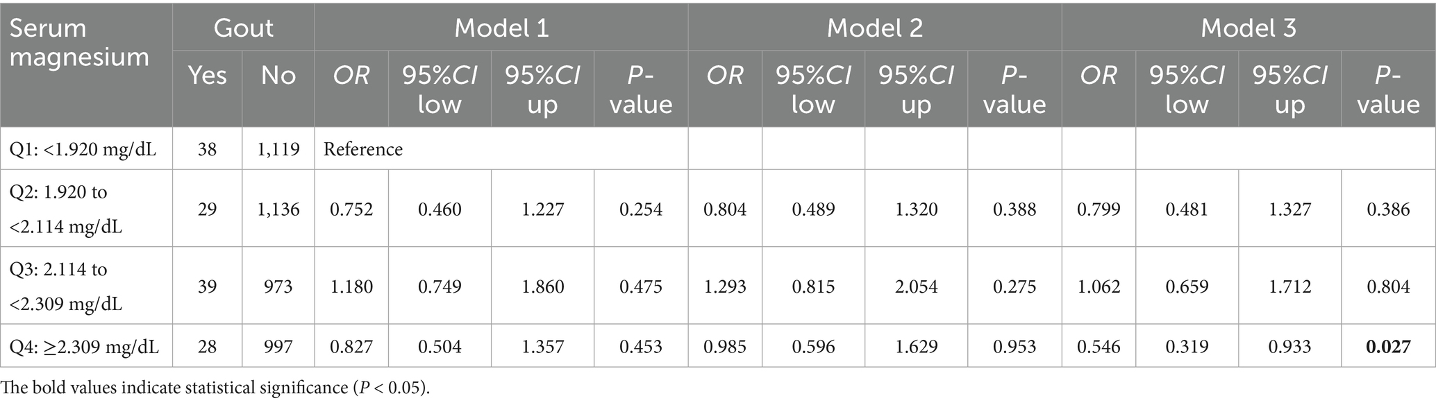 Dietary magnesium intake was categorized into quartiles: Q1 < 0.203 g, Q2 = 0.203 to <0.272 g, Q3 = 0.272 to <0.358 g, and Q4 ≥ 0.358 g. In the univariate logistic regression model (model 1), high magnesium intake (Q4) was significantly associated with lower gout risk than low magnesium intake (Q1) (OR = 0.788, 95% CI: 0.628–0.990, p = 0.046). After adjustment for sex and age as covariates in the multivariate model (model 2), magnesium intake remained a protective factor (OR = 0.685, 95% CI: 0.521–0.899, p = 0.009). Finally, in the fully adjusted model (model 3), incorporating all covariates, high magnesium intake (Q4) continued to demonstrate a protective effect against gout (OR = 0.738, 95% CI: 0.550–0.989, p = 0.049) (Table 4; Supplementary Table 8). This result has borderline statistical significance, indicating that dietary magnesium intake is possibly associated with gout risk and may have potential protective effects.