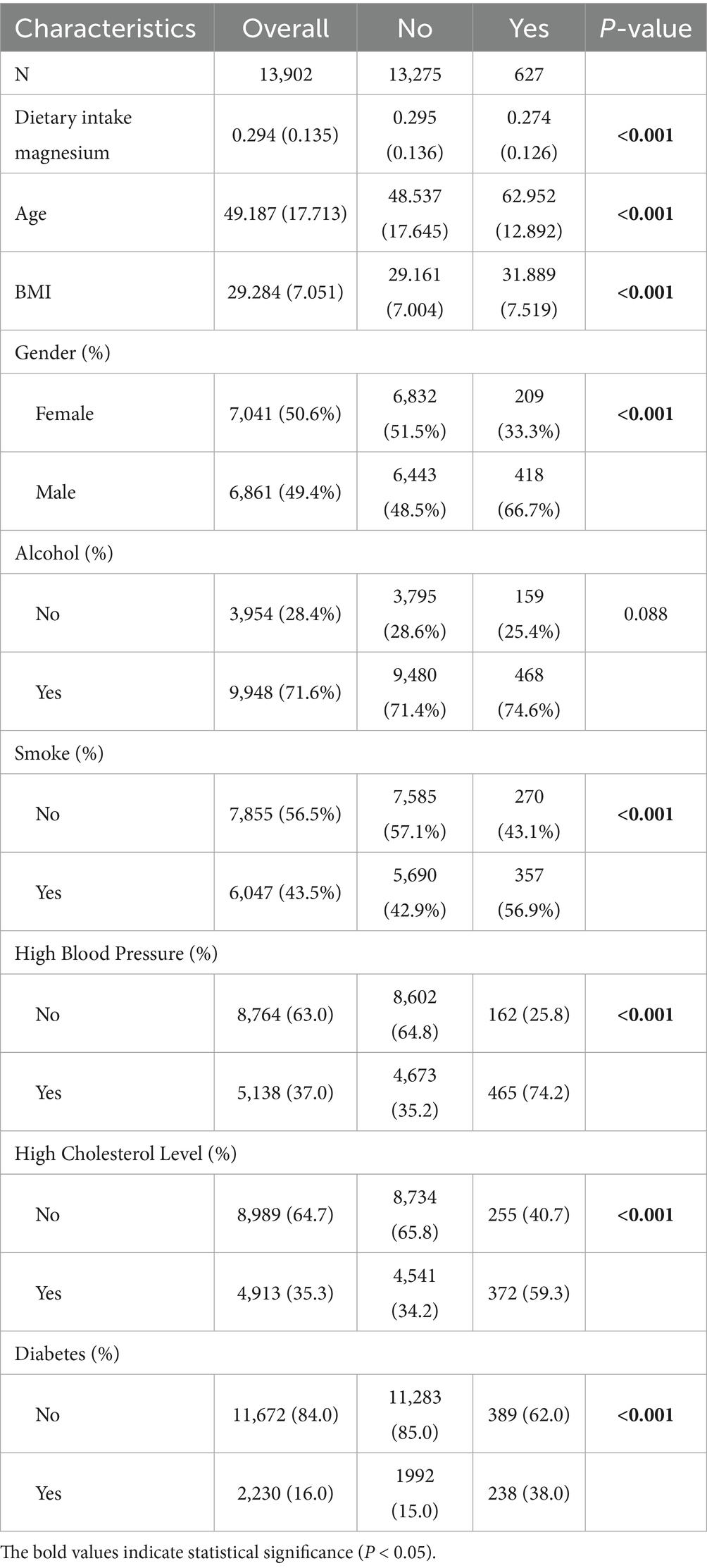 After data processing and filtering of NHANES data, a total of 13,902 valid samples were obtained, including 627 gout cases and 13,275 controls (Figure 7). The baseline study data indicated that magnesium intake in the gout patient group was significantly lower than that in the control group (p < 0.001). Additionally, significant differences were found in factors such as age, sex, BMI, smoking status, high blood pressure, high cholesterol level, and diabetes between the gout group and the control group (Table 3).
