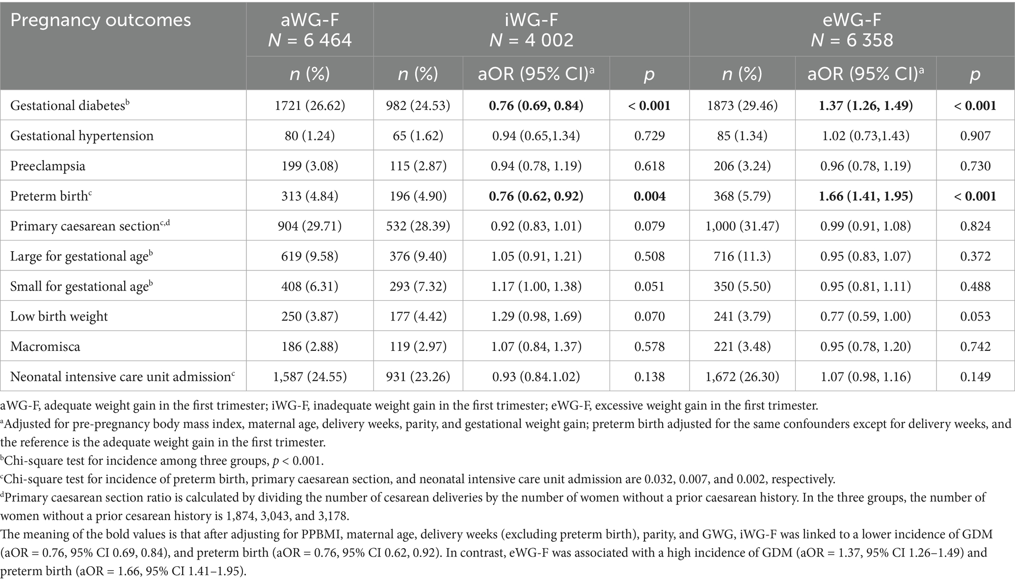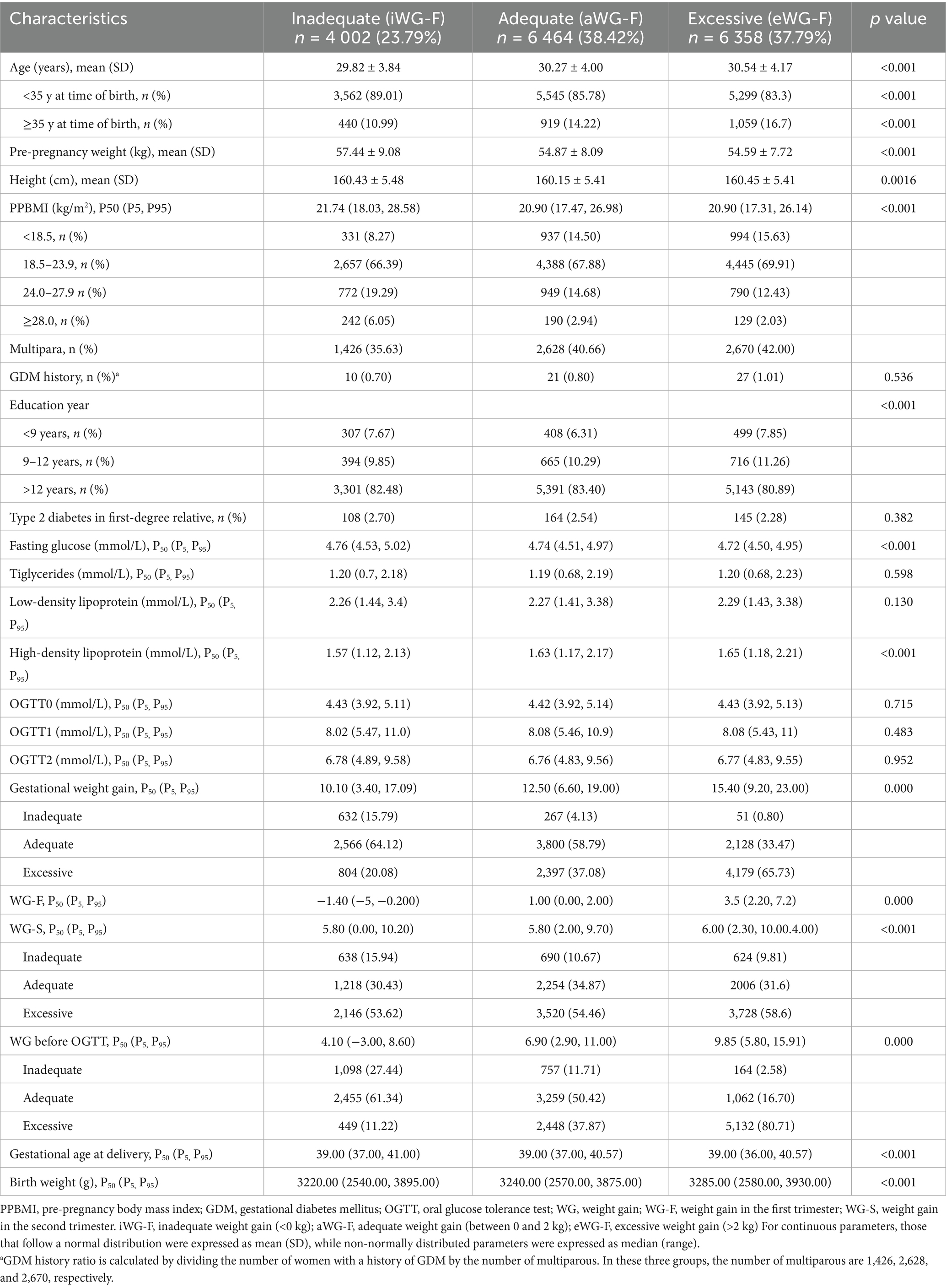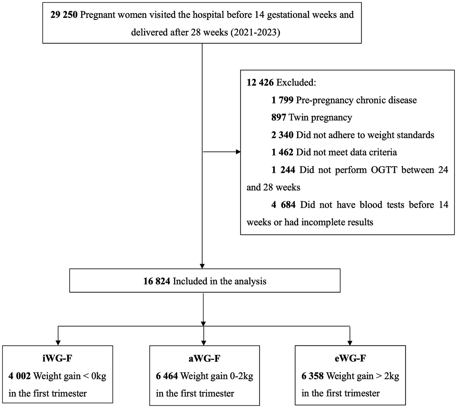 Patients were enrolled from January 2021 to December 2023. The inclusion criteria were: (1) first visit before 14 gestational weeks, (2) singleton pregnancy, and (3) delivery after 28 weeks. Exclusion criteria were: (1) pre-existing chronic conditions such as heart, kidney, or thyroid disease, type 1 or type 2 diabetes, hypertension, (2) non-compliance with weight monitoring, (3) incomplete documented medical records, (4) OGTT not performed between 24 and 28 weeks, and (5) missing blood test results in the first trimester. According to the weight monitoring and evaluation standards for pregnant women by the Chinese Nutrition Society (18), individuals were categorized into three groups based on WG-F: weight gain <0 kg as inadequate (iWG-F), weight gain between 0 and 2 kg as adequate (aWG-F), and weight gain >2 kg as excessive (eWG-F). (Figure 1).
