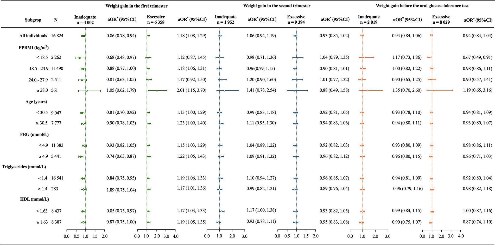 Figure 2. Association of trimester-specific weight gain with gestational diabetes incidence across subgroups. PPBMI, prepregnancy body mass index; FBG, fasting blood glucose; HDL, high-density lipoprotein. *The primary independent variable was categorized weight gain by trimester, and the outcome variable was gestational diabetes mellitus. For all individuals, confounding variables included maternal age, PPBMI, parity, educational level, gestational age at delivery, FBG, triglycerides, and HDL. Subgroup analyses excluded clinical factors specific to each subgroup from the list of confounding variables. Adequate weight gain served as the reference category.