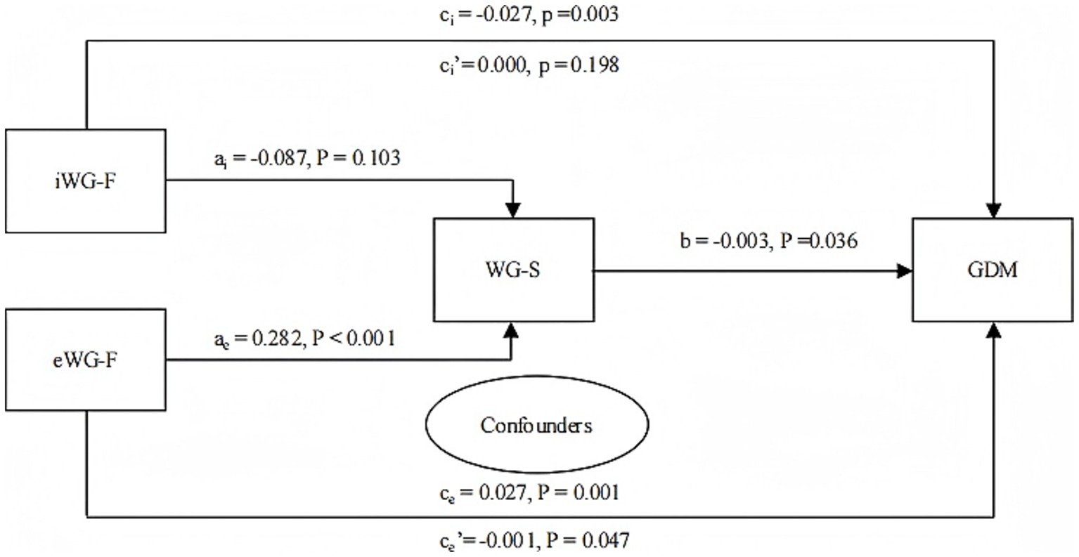 Figure 3. Mediation effect of WG-S on the relationship between iWG-F, eWG-F, and GDM (n = 16,824). iWG-F, inadequate weight gain in the first trimester; eWG-F, excessive weight gain in the first trimester; WG-S, weight gain in the second trimester. GDM, gestational diabetes mellitus. Confounders: Prepregnancy body mass index, parity, fasting glucose, triglycerides, high-density lipoprotein, age, family history of diabetes, history of gestational diabetes, and education level. ai: Regression coefficient of iWG-F vs. WG-S; ae: Regression coefficient of eWG-F vs. WG-S; b: Regression coefficient of WG-S vs. GDM; ci: Total effect, regression coefficient when iWG-F vs. GDM (no mediator variable WG-S in the model); ci’: Indirect effect, regression coefficient when iWG-F vs. GDM (mediator variable WG-S in the model); ce: Total effect, regression coefficient when eWG-F vs. GDM (no mediator variable WG-S in the model); ce’: Indirect effect, regression coefficient when eWG-F vs. GDM (mediator variable WG-S in the model).