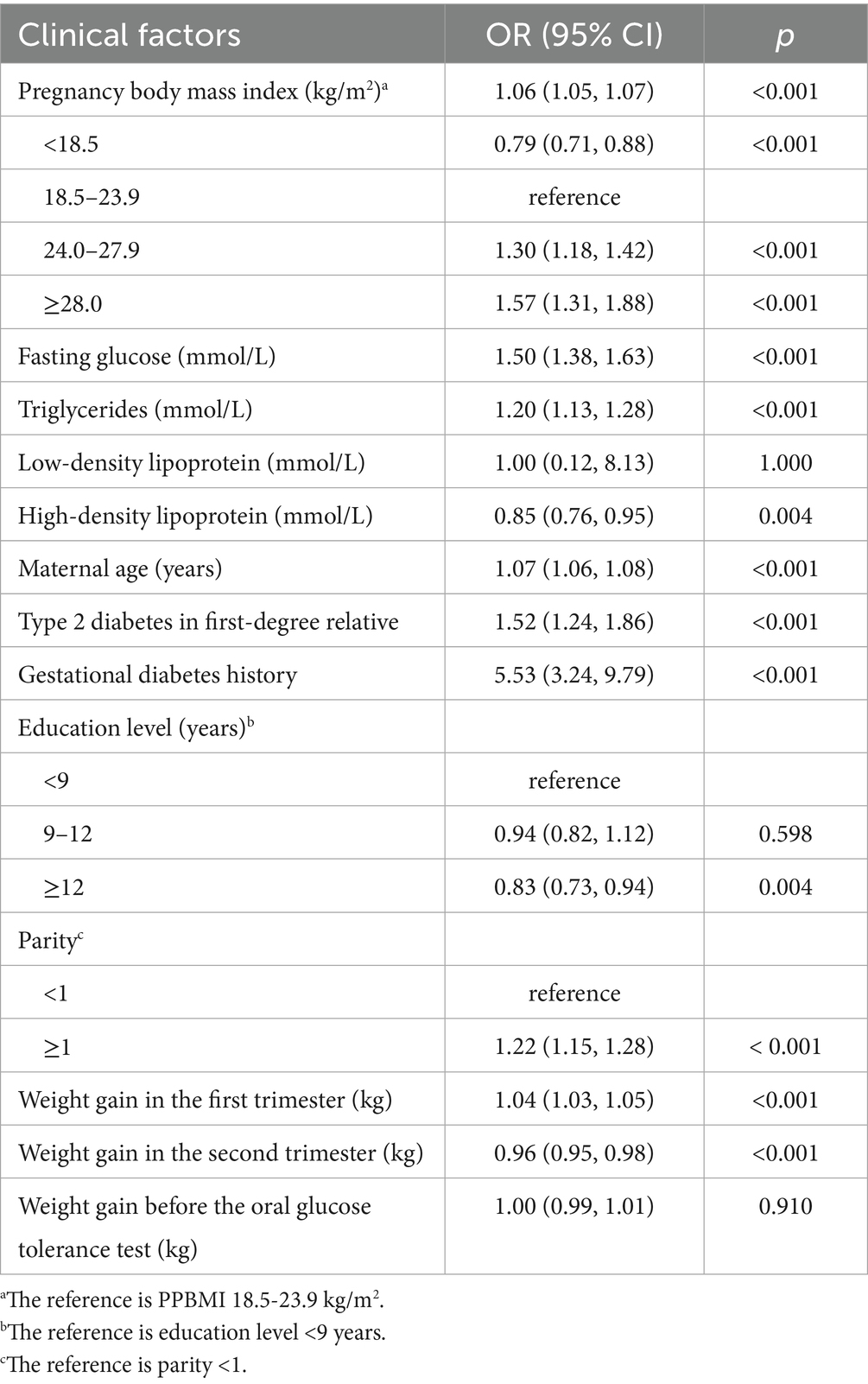 Factors, significantly associated with an elevated risk of GDM, included PPBMI (OR = 1.06, 95% CI 1.05, 1.07), maternal age (OR = 1.07, 95% CI 1.06, 1.08), parity ≥1 (OR = 1.22, 95% CI 1.15, 1.28), fasting glucose (OR = 1.50, 95% CI 1.38, 1.63) and triglycerides levels (OR = 1.20, 95% CI 1.13, 1.28) in early pregnancy, type 2 diabetes in first-degree relative (OR = 1.52, 95% CI 1.24, 1.86), a history of GDM (OR = 5.53, 95% CI 3.24, 9.79), and WG-F (OR = 1.04, 95% CI 1.03, 1.05). Conversely, WG-S (OR = 0.96, 95% CI 0.95, 0.98), HDL levels (OR = 0.85, 95% CI 0.76, 0.95), and having 12 or more years of education (OR = 0.83, 95% CI 0.73, 0.94) were linked to a reduced risk of GDM. WG before OGTT had no significant association with GDM (p = 0.910) (Table 3). The cutoff values were 30.5 years for maternal age, 1.4 mmol/L for triglycerides, 4.9 mmol/L for fasting glucose, and 1.63 mmol/L for HDL.