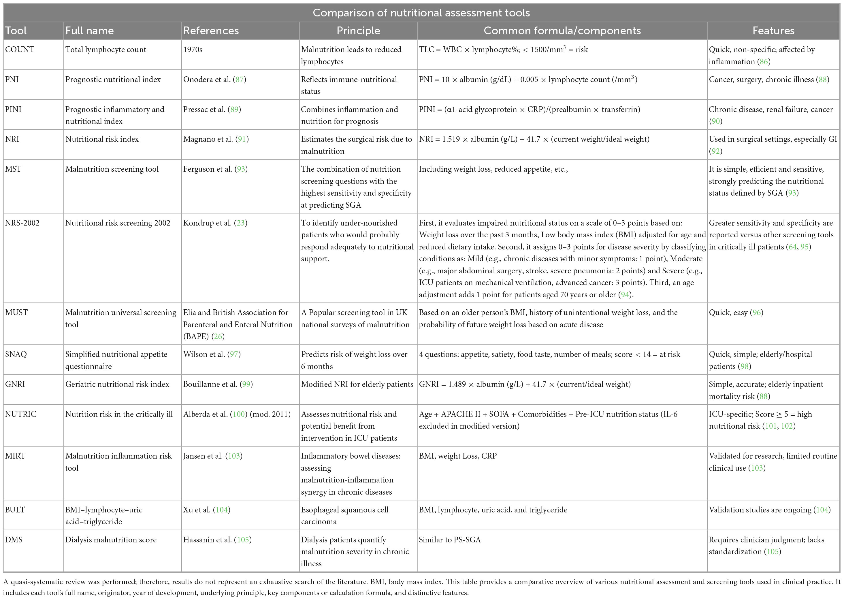 Given these limitations, a critical synthesis of available screening and assessment methods is urgently needed to guide clinicians in selecting tools tailored to specific cancer types, treatment stages, and patient populations. In addition, the integration of effective nutritional interventions has demonstrated the potential to improve clinical outcomes and quality of life (17, 18). This review provides a comprehensive comparison of existing malnutrition screening and assessment strategies, offering evidence-based guidance for optimizing nutritional management in oncology.
