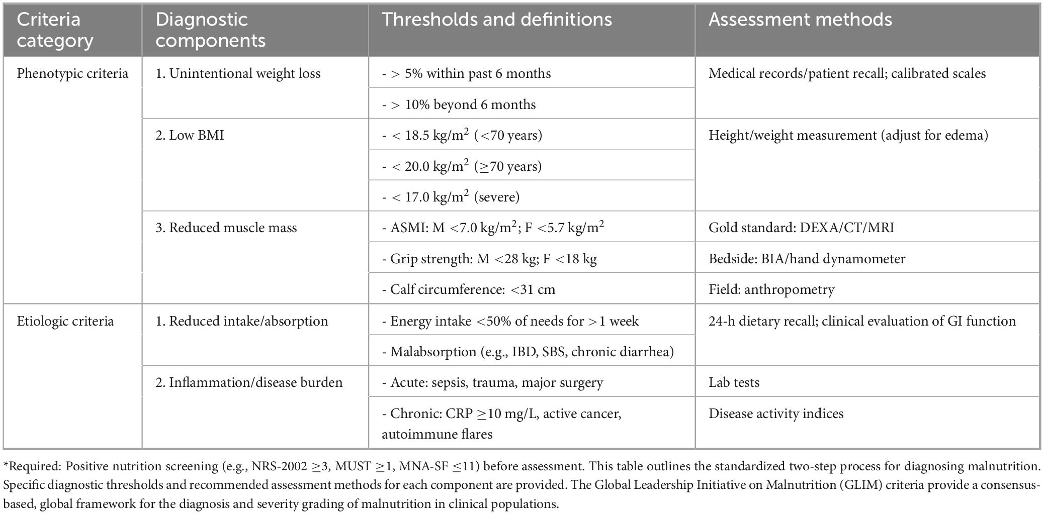 Global Leadership Initiative on Malnutrition (GLIM) is a relatively new, widely adaptable tool with higher sensitivity and specificity to disease-related malnutrition (40). Table 3 outlines the standardized two-step process for diagnosing malnutrition in GLIM. The diagnosis of GLIM is based on five criteria, including three phenotypic criteria and two pathological criteria. The three phenotypic criteria are involuntary weight loss (weight loss > 5% within six months or weight loss > 10% for more than six months), low BMI (adult < 18.5 kg/m2), muscle mass reduction (grip strength measurement, male < 28 kg, female < 18 kg); the two pathological criteria are reducing food intake or undernutrition (food intake < 50% requirement, lasting > 1 week), inflammation or disease burden (burns, severe infections and other systemic inflammatory reactions) (34). At the time of diagnosis, the patient should meet at least one phenotype standard and one pathological standard at the same time. At the same time, the phenotypical criteria of GLIM can also be used to assess the severity of malnutrition, which is divided into moderate (stage 1) and severe (stage 2) (41). In addition, the scope of application of GLIM is particularly wide and applicable to global clinical environments, including inpatients, community medical care, and chronic disease management (41).