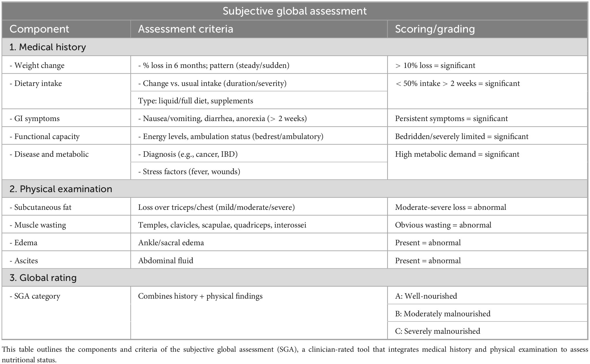 Patients-Generated Subjective Global Assessment (PG-SGA) is a further development of Subjective Global Assessment (SGA), a nutritional assessment tool specially tailored for tumor patients (42). Table 4 outlines the components and criteria of the Subjective Global Assessment (SGA). The evaluation of PG-SGA is based on two parts: patient self-assessment and professional evaluation. The patient’s self-assessment includes weight changes, dietary intake, and symptoms affecting eating and mobility, with a score range of 0–13 points; professional evaluation includes metabolic needs, disease-related stress, and physical examination with a total score of 0–7 (43, 44). The standard of testing is that when the total score is greater than or equal to 9 points, it is severe malnutrition. A total of 2–8 points prompt the need to adjust the diet or oral nutrition. Regular testing is enough when 0–1 point is enough. At the same time, it should be noted that some guidelines suggest that when the PG-SGA score in tumor patients is > 4, it indicates nutritional risks (45). It is characterized by hierarchical intervention based on the total score to assess health status, demonstrating high sensitivity and accuracy. Its effectiveness significantly exceeds that of GLIM in the treatment of certain tumors (46).