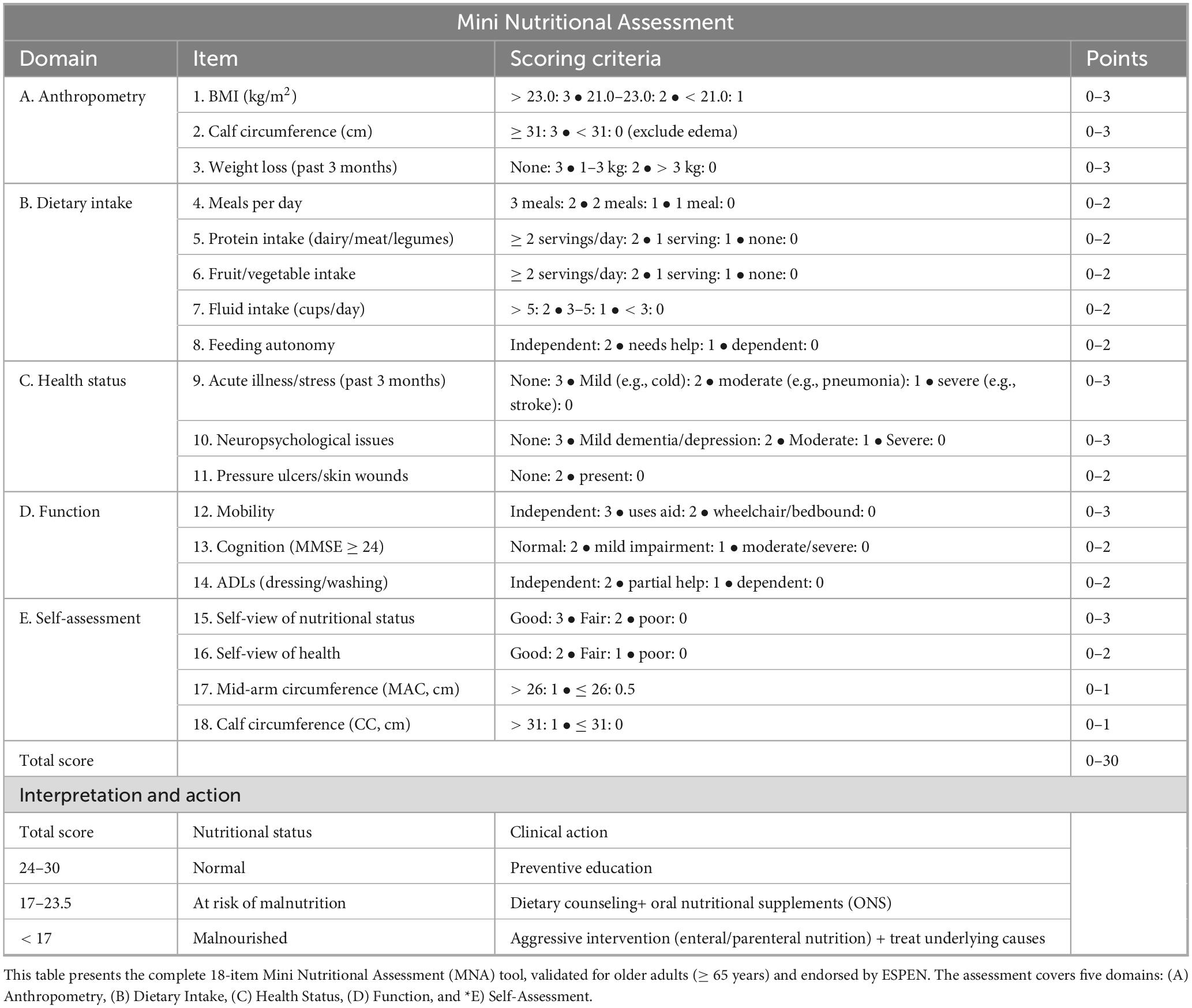 Current screening and assessment tools for cancer-related malnutrition show considerable variability in effectiveness and consistency across clinical contexts. Ruan et al. (47) employed hierarchical Bayesian latent class meta-analysis to compare three tools—MNA, NRS-2002, and PG-SGA—and demonstrated that PG-SGA had superior diagnostic accuracy, achieving sensitivity and specificity of 96.4% and 90.5%, respectively (2). In contrast, MNA achieved a sensitivity of 91.0% and specificity of 72.0%, while NRS-2002 exhibited lower sensitivity (74.7%) but higher specificity (85.4%) (47). Table 5 details the full 18-item MNA. These findings highlight PG-SGA’s value for early detection of malnutrition risk, particularly in patients requiring urgent intervention. Similarly, Gascón-Ruiz et al. (48) reported that the GLIM criteria significantly outperformed ESPEN standards in detecting malnutrition (46.7% vs. 21.2%) (48), reinforcing the importance of evidence-based tool selection tailored to patient conditions (49).