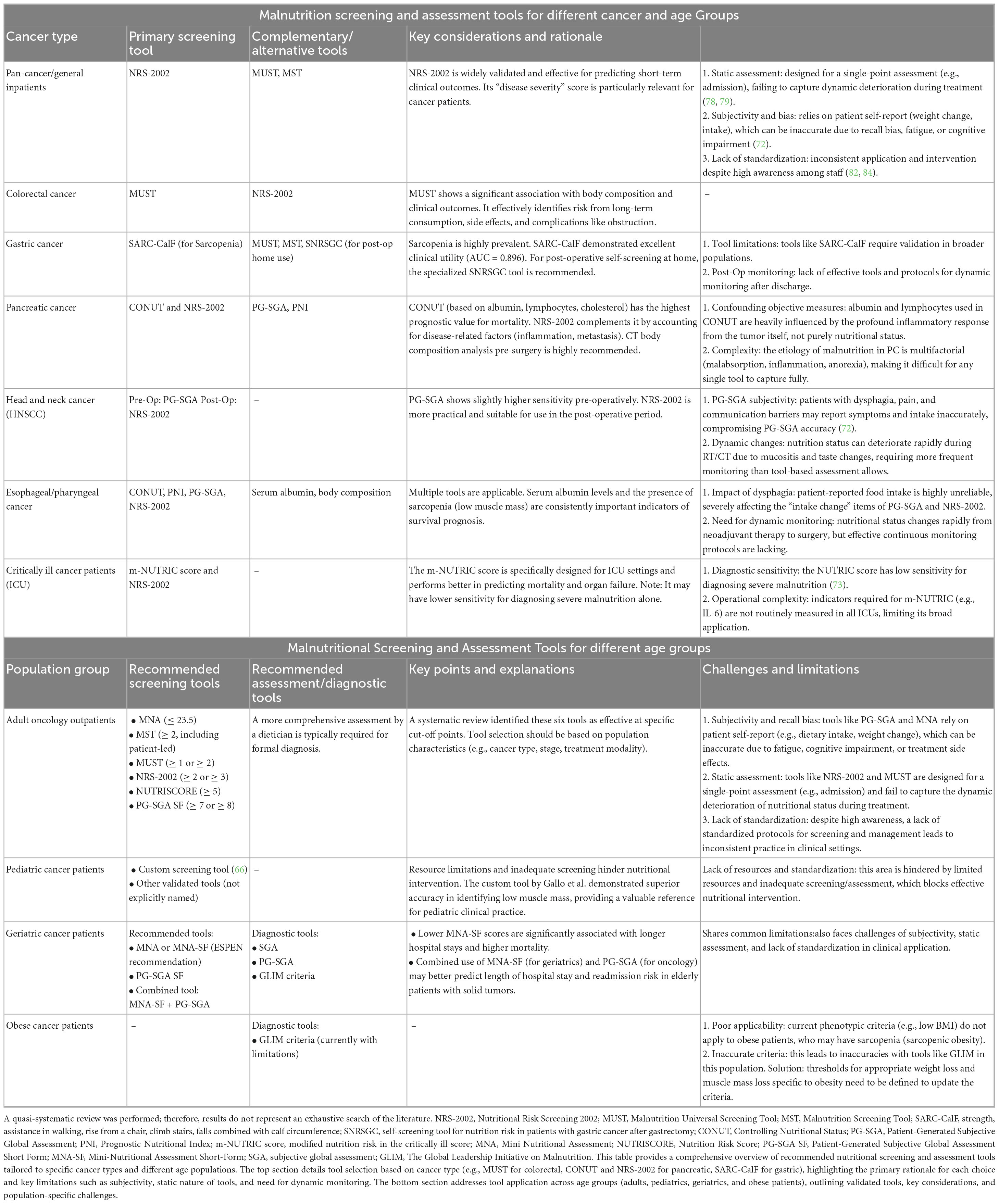 Tool applicability is influenced by healthcare resources. In low-resource settings, simple, low-cost instruments like MUST and MST are practical due to minimal equipment requirements (53, 54). High-resource centers can leverage comprehensive multimodal assessments, integrating PG-SGA, CONUT, and CT imaging for precision care. However, implementation gaps remain a persistent challenge. Despite strong awareness of malnutrition’s impact, clinician adoption rates of validated tools remain low, and training gaps hinder consistency (70–72).