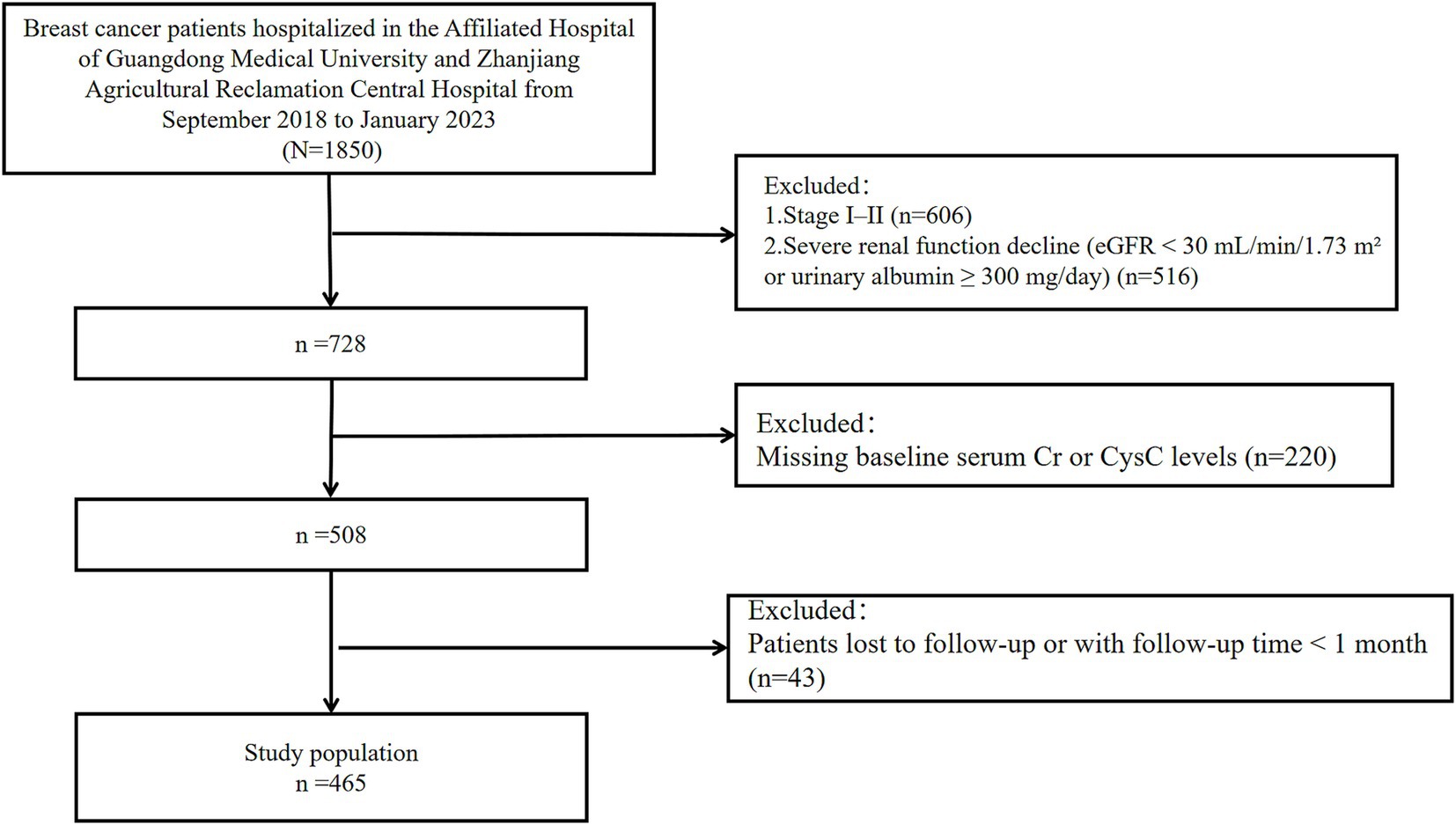 A large-scale retrospective clinical study (8) involving 3,060 patients with various malignancies (including breast cancer) demonstrated a significant association between serum creatinine to cystatin C ratio and survival outcomes in cancer patients. However, this study was exclusively conducted in a Korean population, with only 113 breast cancer cases (accounting for 3.7% of the cohort), and lacked breast cancer-specific stratified analyses. The generalizability of these findings to advanced breast cancer populations remains uncertain. To address this knowledge gap, we performed a retrospective analysis of electronic medical records from two tertiary medical centers in Zhanjiang, China, focusing specifically on stage III-IV breast cancer patients. This study was designed to explore the relationship between the creatinine-to-cystatin C ratio (CCR) and 1-year all-cause mortality in breast cancer patients, while evaluating the clinical validity of CCR as an independent serological prognostic marker for 1-year mortality risk.