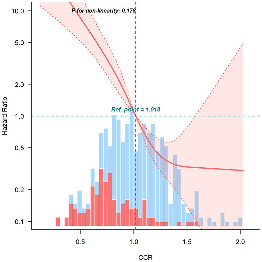 Figure 2. Restricted cubic spline curve for the association between creatinine–cystatin C ratio and 1-year all-cause mortality risk of breast cancer.