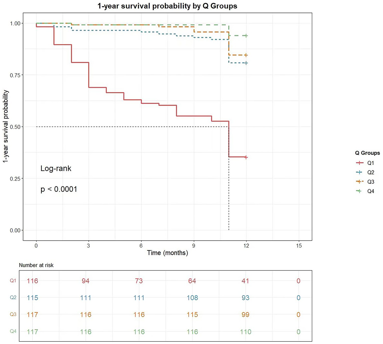 Kaplan–Meier curves (Figure 3) demonstrated the 1-year overall survival probabilities of patients stratified by CCR quartiles. The log-rank test revealed significant differences in mortality risk among the four groups (p < 0.0001). The survival curves showed progressive separation with decreasing CCR levels, with the Q1 group (lowest CCR) exhibiting the highest 1-year all-cause mortality rate (lowest 1-year survival probability).