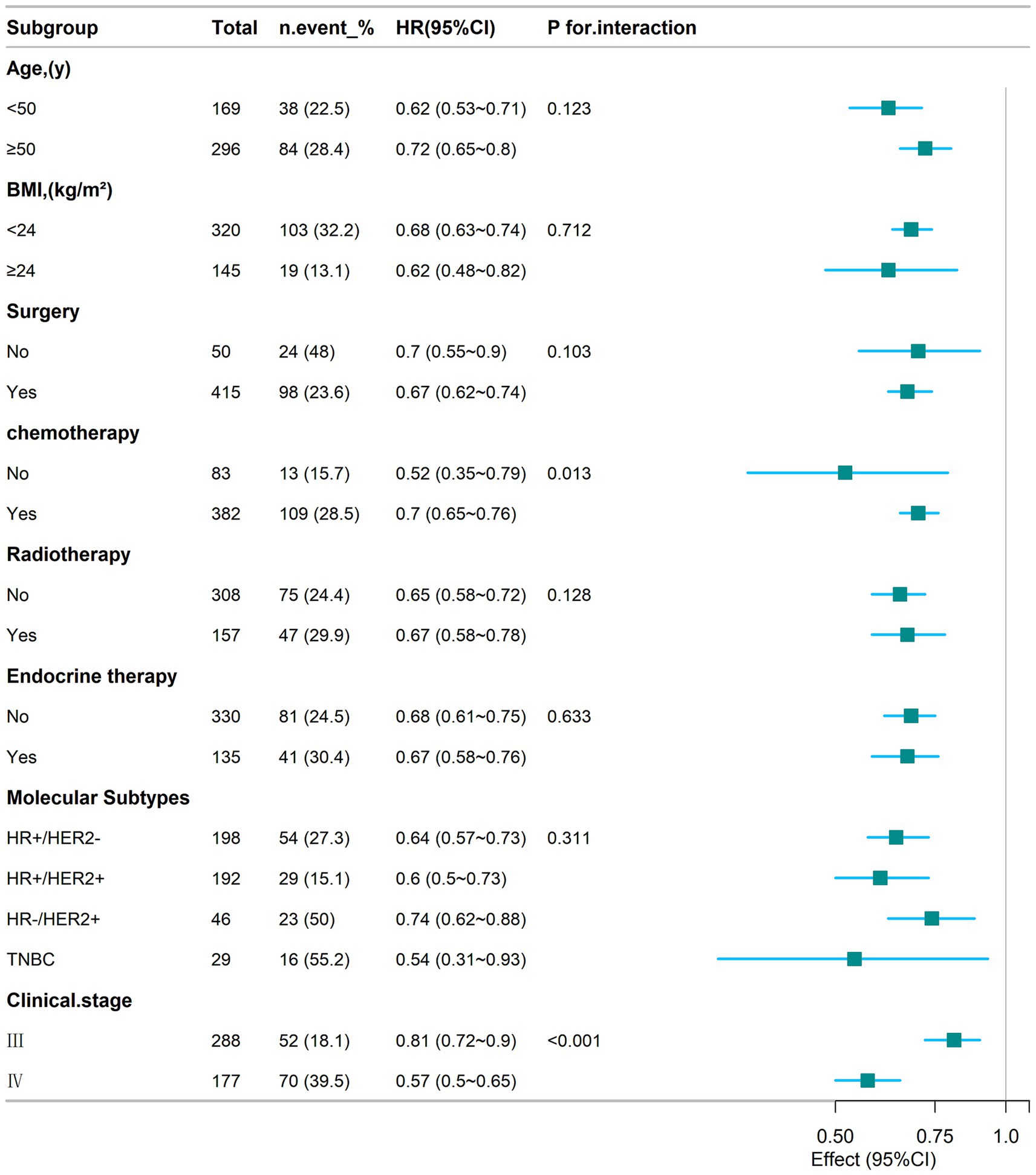 To assess the impact of missing value imputation on the results, we repeated all primary analyses using the original unimputed dataset (n = 465). Cox regression models for 1-year mortality were reconstructed with identical covariates. The unimputed analysis (Supplementary Table S2) revealed that in the fully adjusted model, each 10-unit increase in CCR was associated with a 31% reduction in 1-year all-cause mortality risk (HR = 0.69, 95% CI: 0.64–0.75) in advanced breast cancer patients. When analyzed by CCR quartiles, compared with the lowest quartile group (Q1), the highest quartile group (Q4) showed significantly lower 1-year mortality risk (HR = 0.06, 95% CI: 0.02–0.14). The RCS curve (Supplementary Figure 1) and subgroup analysis (Supplementary Figure 2) from unimputed data similarly replicated the negative linear association (P for non-linear = 0.195) and interaction patterns, with significant differences primarily observed for chemotherapy (P for interaction = 0.014) and clinical stage (P for interaction<0.001).
