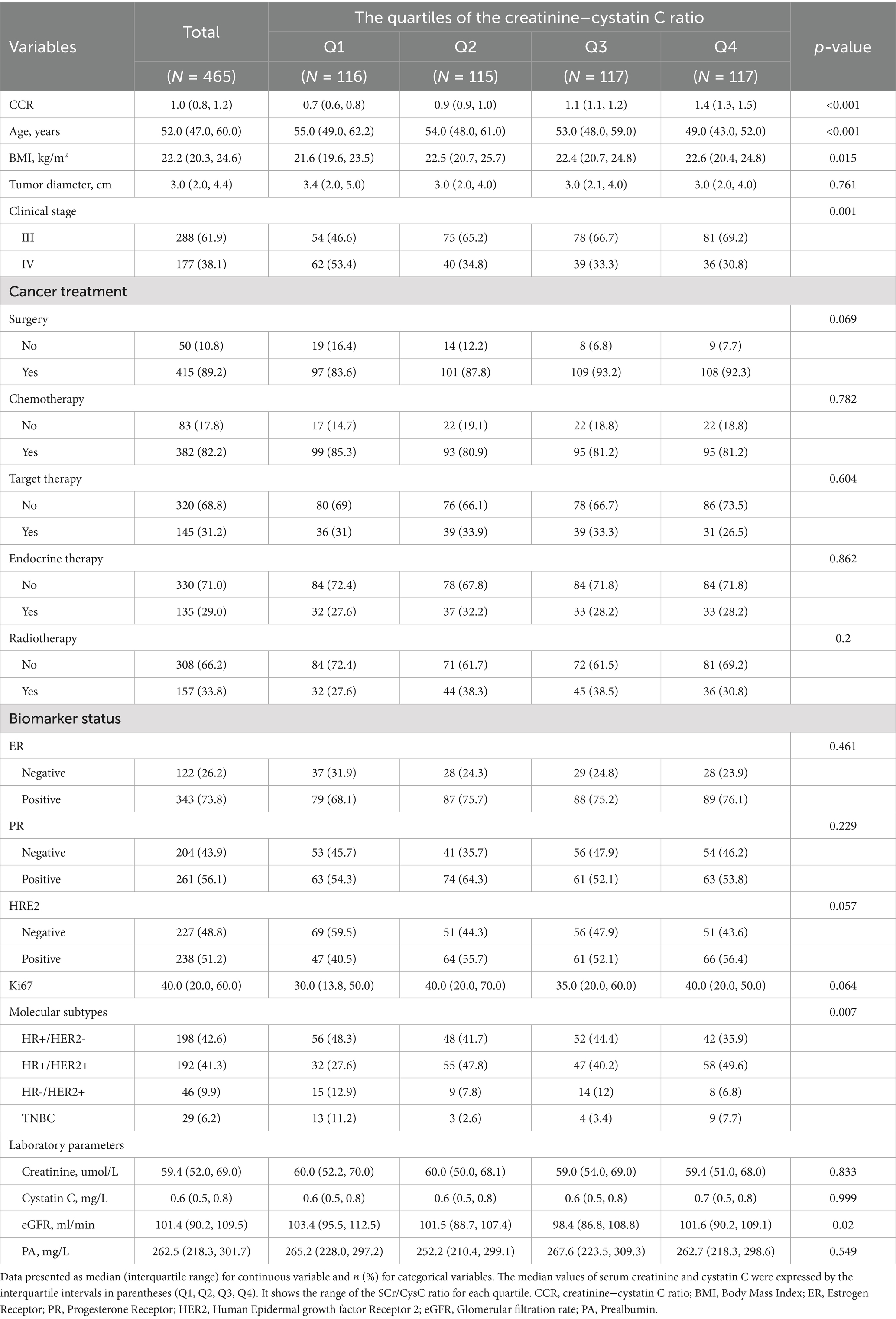 The study ultimately included 465 patients with advanced breast cancer (Table 1). The overall population was predominantly middle-aged and elderly, with a median age of 52.0 (IQR: 47.0–60.0) years. Compared with the lowest CCR group (Q1), patients in the highest CCR group (Q4) were younger (median age: 49.0 vs. 55.0 years), had a higher BMI (22.6 vs. 21.6 kg/m2), exhibited earlier clinical staging (proportion of stage III: 69.2% vs. 46.6%), and demonstrated higher HER2 positivity (56.4% vs. 40.5%), HR+/HER2 + subtype prevalence (49.6% vs. 27.6%), and surgical intervention rates (92.3% vs. 83.6%). Conversely, the CCR Q1 group showed a higher proportion of stage IV disease (53.4% vs. 30.8%), TNBC subtype (11.2% vs. 7.7%), and non-surgical management (16.4% vs. 7.7%). However, no significant differences were observed across CCR quartile groups regarding tumor diameter, serum creatinine levels, cystatin C levels, PA levels, ER status, PR status, HER2 status, Ki67 expression levels, or treatment modalities (surgery, targeted therapy, chemotherapy, radiotherapy, endocrine therapy). Notably, while serum creatinine (median: Q1 = 60.0, Q2 = 60.0, Q3 = 59.0, Q4 = 59.4 μmol/L; IQR: 54.0–65.0) and cystatin C (median: Q1 = 0.6, Q2 = 0.6, Q3 = 0.6, Q4 = 0.7 mg/L; IQR: 0.6–0.8) levels showed no statistically significant differences across quartiles (p = 0.833 and p = 0.999, respectively), systematic trends were observed: cystatin C increased slightly from Q1 to Q4 (median: 0.6 vs. 0.7 mg/L), while creatinine remained relatively stable. This pattern reflects the narrow interquartile ranges (IQRs) of both markers, which limited the sensitivity of Kruskal-Wallis tests to detect subtle differences. Crucially, the CCR ratio (median: Q1 = 0.8, Q2 = 1.0, Q3 = 1.1, Q4 = 1.2; p < 0.001) amplified these relative changes, enabling effective stratification of muscle mass status.