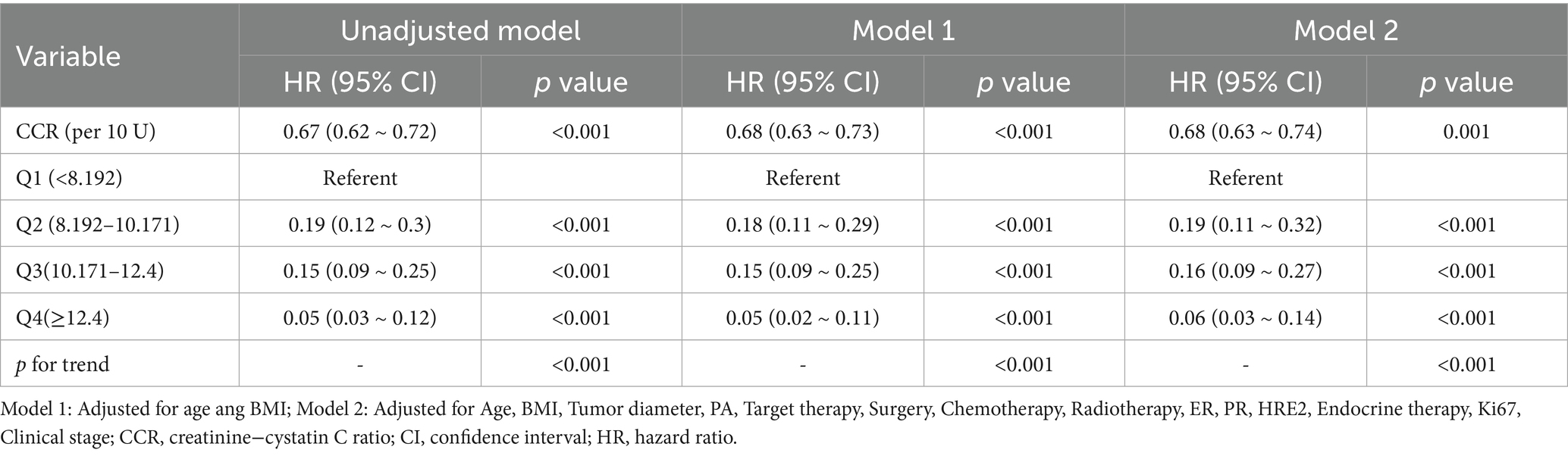 To evaluate the association between the creatinine-cystatin C ratio and 1-year all-cause mortality, we constructed three Cox proportional hazards models (Table 2): Unadjusted model, No covariates were adjusted; Model 1, Adjusted for age and BMI based on the unadjusted model; Model 2, Further adjusted for tumor diameter, PA, targeted therapy, surgery, chemotherapy, radiotherapy, ER, PR, HER2, endocrine therapy, Ki67, and clinical stage in addition to Model 1. When analyzed as a continuous variable, each 10-unit increase in CCR was associated with a 33% reduction in mortality risk in the unadjusted model (HR = 0.67, 95% CI: 0.62–0.72, p < 0.001), a 32% reduction in Model 1 (HR = 0.68, 95% CI: 0.63–0.73, p < 0.001), and a 32% reduction in Model 2 (HR = 0.68, 95% CI: 0.63–0.74, p = 0.001). When analyzed by quartiles, with Q1 (lowest CCR group) as the reference, the HR values for Q2, Q3, and Q4 showed a progressively decreasing trend. In the fully adjusted Model 2, the Q4 group exhibited a significantly lower mortality risk compared to Q1 (HR = 0.06, 95% CI: 0.03–0.14, p < 0.001). The trend test yielded p-values < 0.001 in all models, confirming a significant linear correlation between CCR and 1-year all-cause mortality.