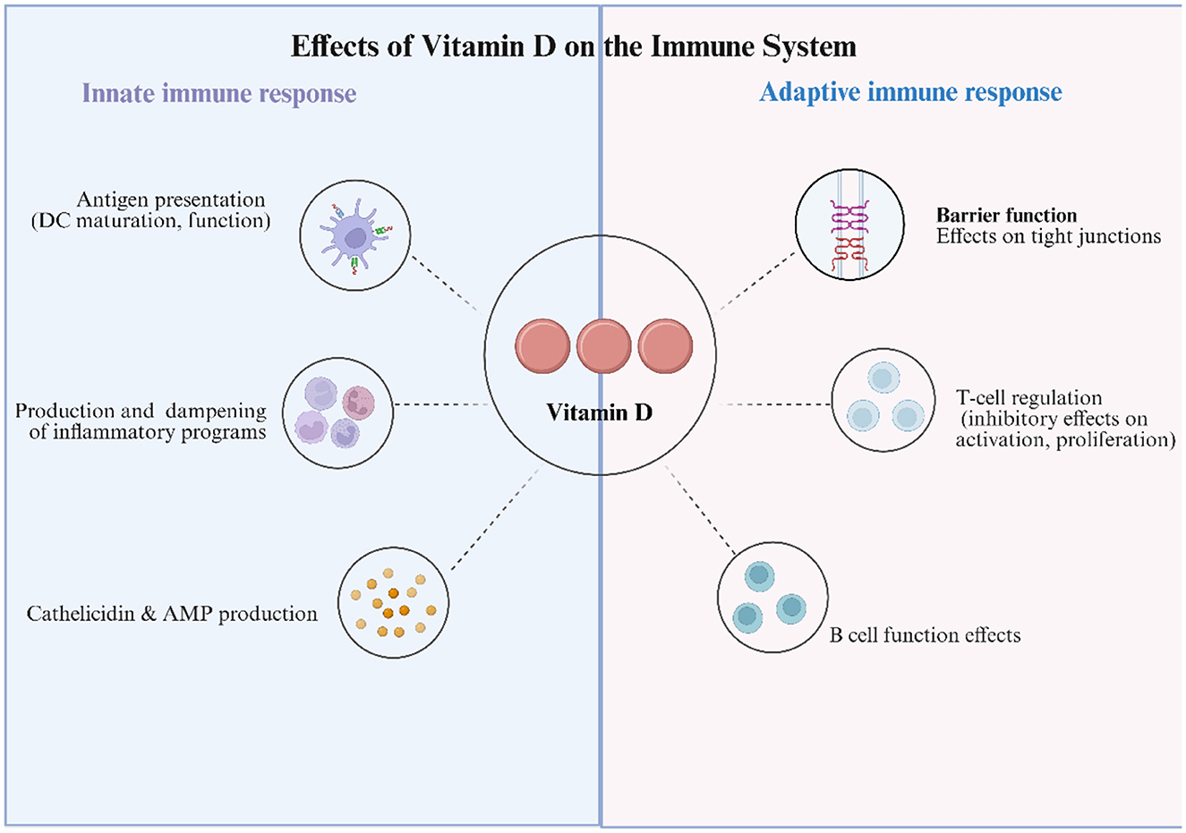 Through the central TLR–CYP27B1–VDR axis, VitD orchestrates an integrated innate immune network encompassing localized antimicrobial responses, immune tolerance, vascular stabilization, and epithelial defense. Maintaining serum 25(OH)D levels within the optimal range of 50–75 nmol/L ensures a balance between anti-infective immunity and calcium safety. From a translational perspective, the development of selective VDR partial agonists and tissue-specific CYP27B1 activators holds promise for adjunctive therapies targeting tuberculosis, multidrug-resistant infections, and immune-mediated diseases (62).
