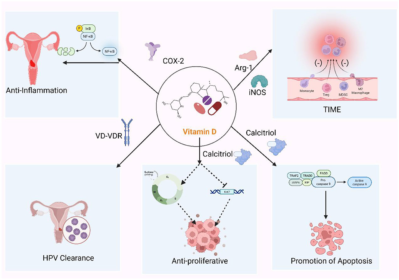 Persistent inflammation is a double-edged sword in carcinogenesis. VitD attenuates key inflammatory axes by down-regulating COX-2, thereby reducing pro-tumorigenic prostaglandin-E2, and by inhibiting chronic NF-κB activation (87). These effects are crucial in HPV infection, where viral oncoproteins (e.g., E6/E7) induce cytokine release that, in turn, sustains viral persistence. VitD interrupts this positive feedback loop, and epidemiological studies consistently show lower rates of persistent HPV and CIN progression in vitamin-D-replete individuals (88).