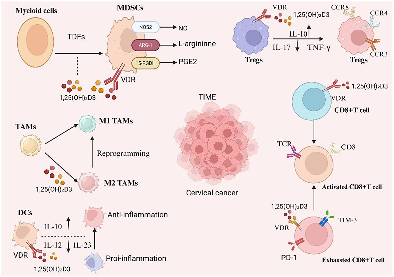 Figure 3. Vitamin D–VDR reprograms the cervical tumor immune microenvironment (TIME). 1,25(OH)2D3 acting via vitamin D receptor (VDR) counteracts tumor-derived factor–driven myelopoiesis by restraining MDSC suppressive programs (↓NOS2/NO and ARG-1–mediated L-arginine depletion; ↑15-PGDH to catabolize PGE2), promotes dendritic cells (DCs) with an anti-inflammatory profile (IL-10↑, IL-12/IL-23↓), and repolarizes tumor-associated macrophages toward M1 while limiting M2 states. In the lymphoid compartment, it enhances regulatory tuning (Tregs with IL-10↑ and IL-17/TNF-γ↓ and characteristic CCR3/CCR4/CCR8 patterns) and modulates CD8+ T cells—supporting activation through TCR signaling and potentially alleviating exhaustion (PD-1/TIM-3). Collectively, these actions soften chronic inflammation and reduce immune suppression within cervical cancer TIME.
