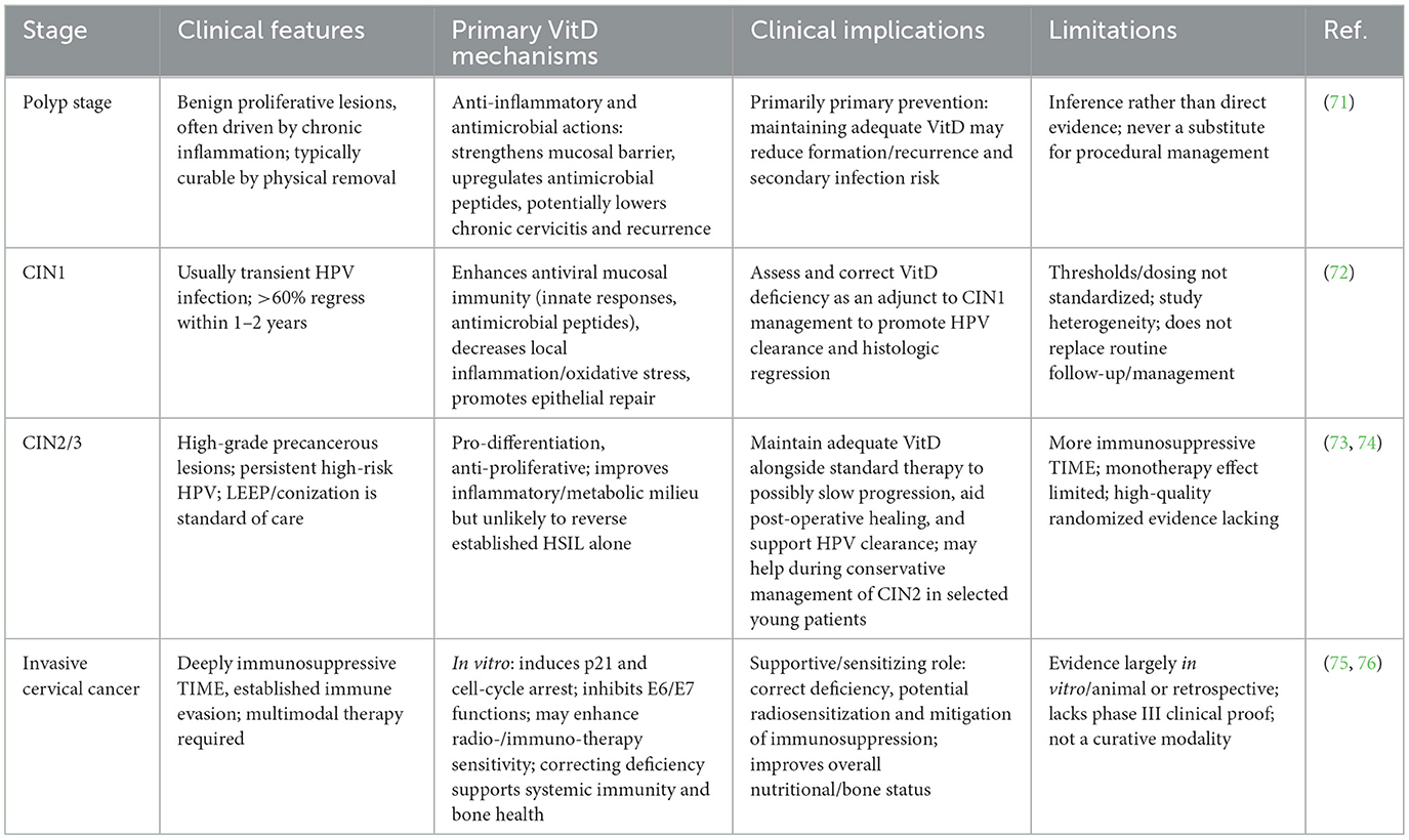 CIN2 and CIN3 are precancerous lesions of the cervix, often indicating persistent high-risk HPV infection and a greater tendency toward neoplastic transformation. Surgery (e.g., LEEP or conization) remains the standard treatment. However, the immune microenvironment still plays a critical role in determining disease progression, and some CIN2 cases can regress spontaneously. The role of VitD in this stage is more complex. On the one hand, its ability to promote cell differentiation and inhibit proliferation may suppress lesion advancement; on the other hand, the microenvironment becomes increasingly immunosuppressive, making VitD alone insufficient for complete reversal. Clinical trials show that high-dose VitD supplementation for 6 months improves metabolic and inflammatory indices in CIN2/3 patients but has limited impact on lesion outcomes. As Avila et al. reported in a review, VitD supplementation did not significantly reduce recurrence rates during post-treatment follow-up in CIN2/3 patients. This suggests that VitD monotherapy is unlikely to eliminate established high-grade lesions (73). Nonetheless, vitamin D may provide auxiliary benefits by improving the local tissue microenvironment, such as reducing the risk of residual disease following surgical intervention and promoting HPV clearance. Some cohort studies also suggest that sufficient VitD status is associated with a lower risk of HSIL. In cases of conservative management of CIN2 (e.g., in young women avoiding immediate surgery), raising VitD levels may help promote lesion regression, though most supporting evidence stems from CIN1 studies. Therefore, although the effect of VitD diminishes in the CIN2/3 stage compared to earlier stages, it still holds potential in slowing lesion progression (74). Clinically, maintaining sufficient VitD levels alongside standard therapies may support immune function and tissue repair, though VitD should not be considered a replacement for excisional procedures.