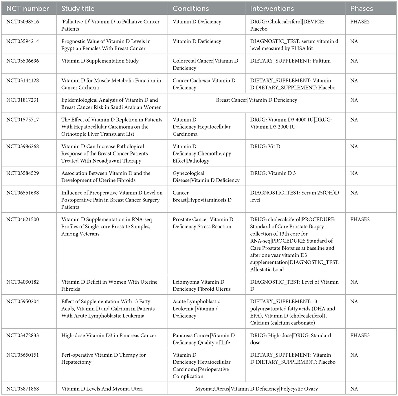 98. Bellerba F, Serrano D, Harriet J, Pozzi C, Segata N, NabiNejad A, et al. Colorectal cancer, vitamin D and microbiota: a double-blind Phase II randomized trial (ColoViD) in colorectal cancer patients. Neoplasia. (2022) 34:100842. doi: 10.1016/j.neo.2022.100842