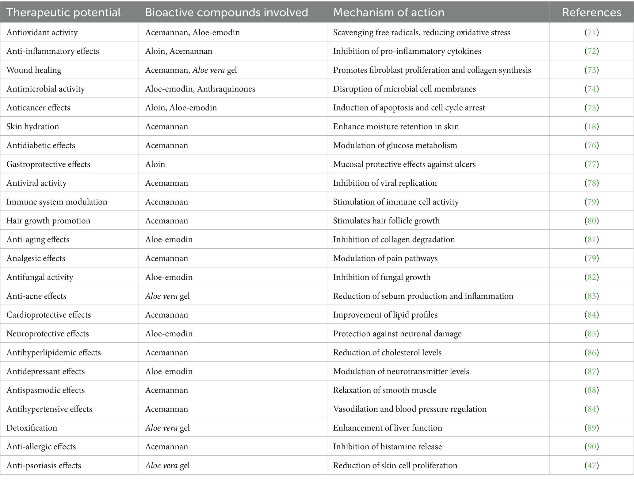 Aloe vera has become prominent in the natural medicine industry due to its potential health advantages. Researchers assert that this multifaceted plant may significantly aid various health-related therapies. Research demonstrated the hepatoprotective effects of Aloe vera extract in male Wistar albino rats, evidenced by a significant reduction in serum alanine transaminase levels, suggesting that its consumption may ensure liver safety alongside additional hematological benefits (38). Furthermore, the nutritional richness of Aloe vera underscores its role in addressing dietary imbalances and providing a wealth of essential elements that can enhance general health. These findings underscore the diverse therapeutic potential of the plant, hence supporting its application in both preventive and remedial health interventions. Consequently, recent study suggests that Aloe vera may serve not only as a treatment for exterior issues but also as a crucial element in enhancing overall health (39). Table 1 and Figure 1 delineate the therapeutic potential of Aloe vera, the associated bioactive chemicals, and their mechanisms of action.