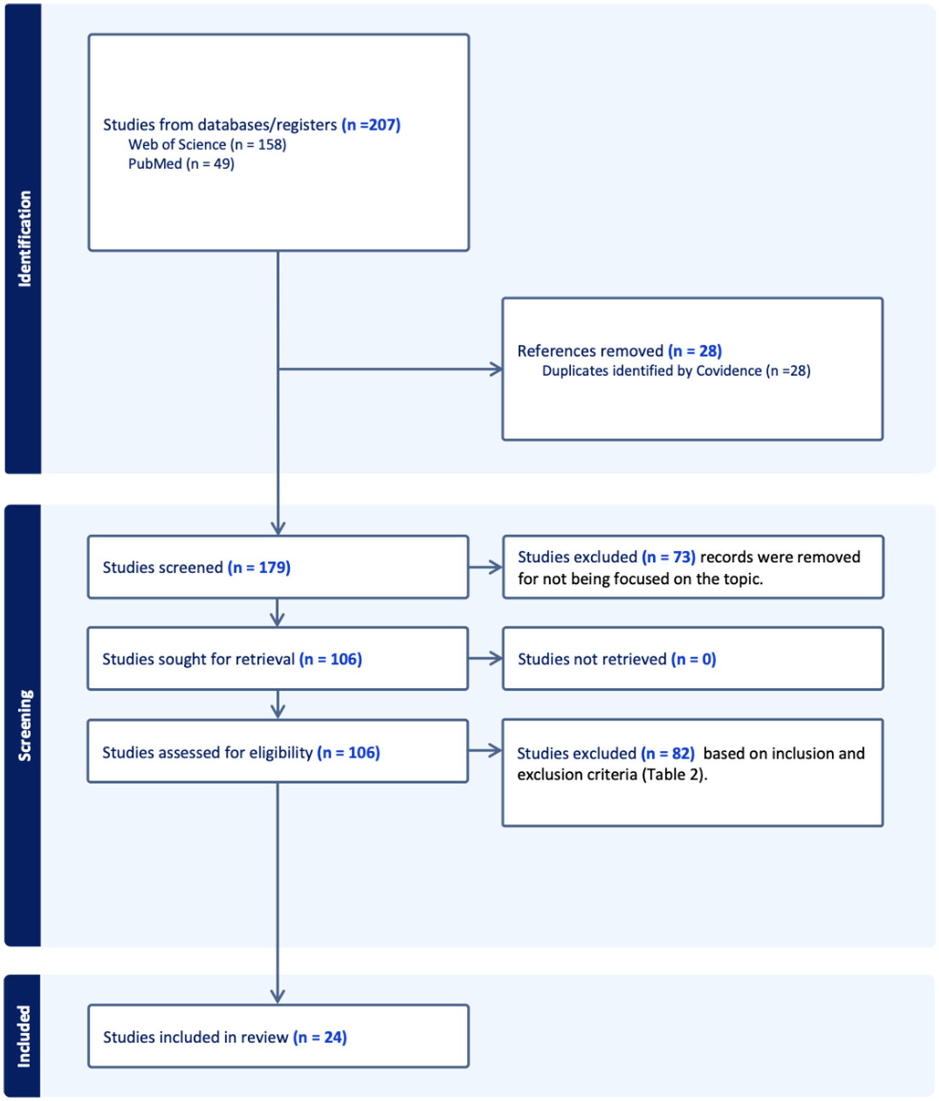 Overall, 207 records were identified through all database searches. After 28 duplicates had been removed, titles and abstracts from the remaining 179 records were screened, and the full text of 106 was assessed for eligibility. Finally, 24 studies were included in this systematic review. A comprehensive flow diagram following the PRISMA criteria of the study selection process is presented in Figure 1.
