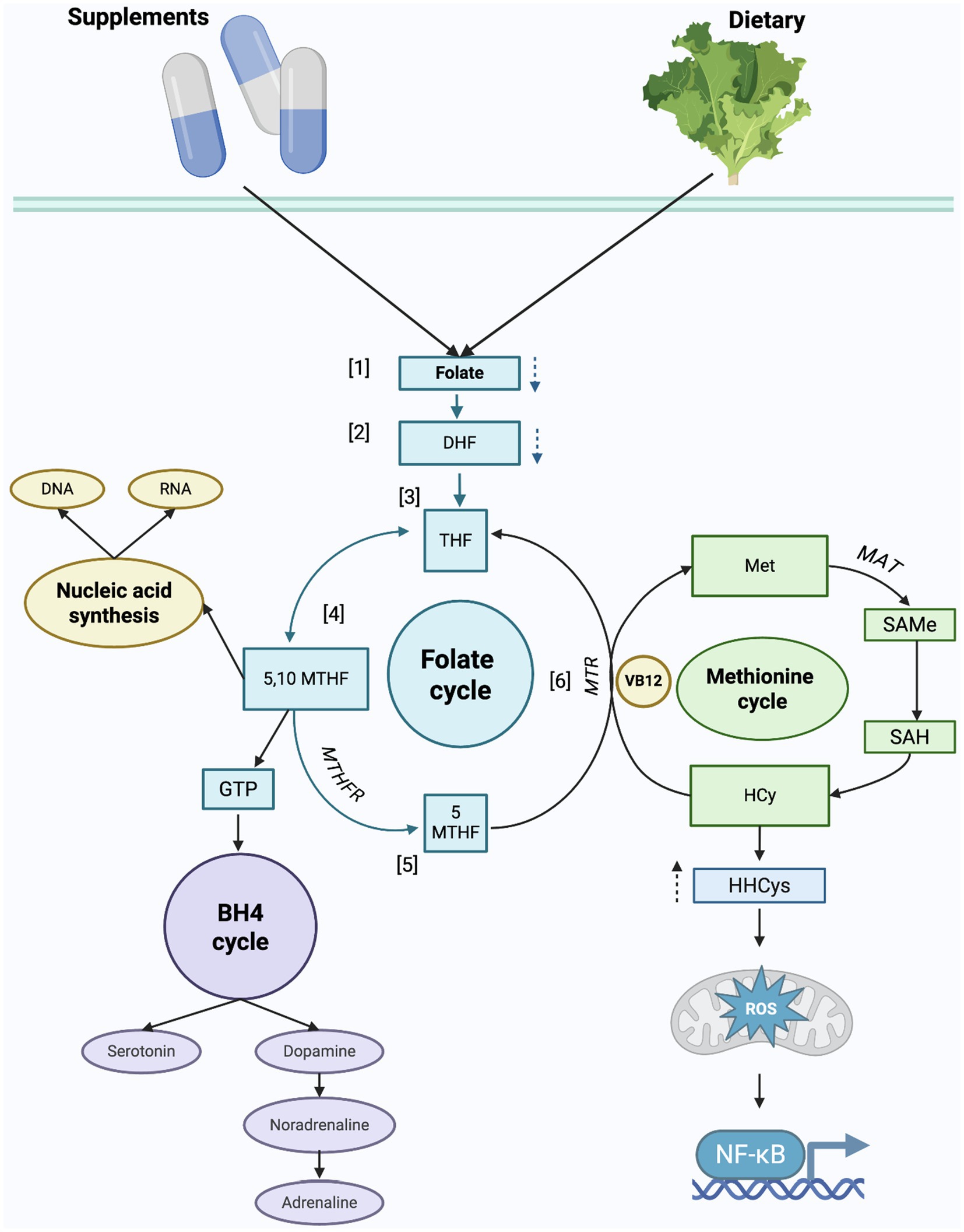 Figure 2. Biological roles of vitamins B9, B12 in folate and methionine cycles related to depression. [1]. Folic acid, the synthetic form of VB9, is reduced to [2] dihydrofolate (DHF) and subsequently reduced to [3] tetrahydrofolate (THF). THF is further catalyzed, and [4] 5,10-methylenetetrahydrofolate (5,10- MTHF) is obtained. 5,10-MTHF is predominantly used in the purine and thymidine synthesis, as mentioned above as the attributed functions of VB9 and VB12. For 5,-10 MTHF to convert to the active form of VB9, [5] methyltetrahydrofolate (5-MTHF), the enzyme methylenetetrahydrofolate reductase (MTHFR) must catalyze the reaction. 5-MTHF together with VB12 is required for the remethylation of homocysteine (HCy) to methionine (Met) in the methionine cycle. [6] The conversion to Met is due to the action of methionine synthase (MTR), which is a VB12-dependent enzyme. Subsequently, Met is converted to S-adenosylmethionine (SAMe) by the S-Adenosylmethionine synthetase (MAT) enzyme. SAMe is a methyl group donor involved in DNA and RNA methylation. In neurotransmitter synthesis, THF derivatives are involved in the regeneration of tetrahydrobiopterin (BH4) from dihydrobiopterin (BH2), an important cofactor in the conversion of amino acids to serotonin, dopamine, and norepinephrine.