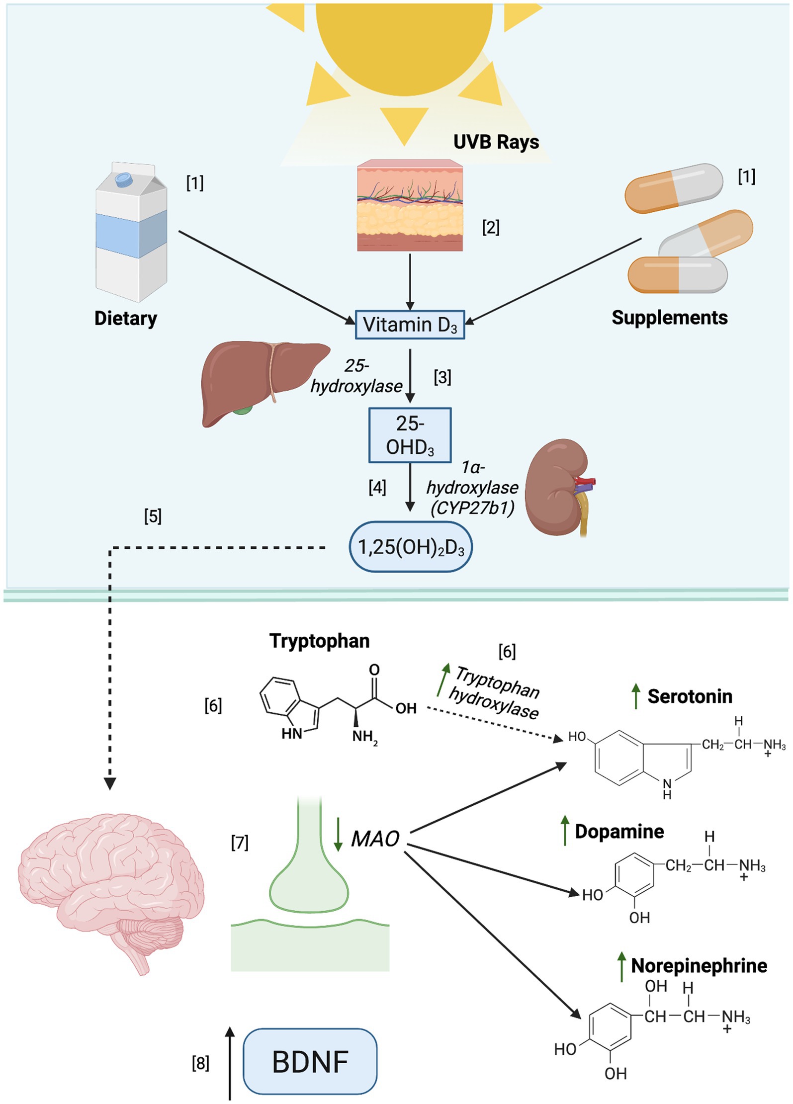 Figure 3. Biological role of vitamin D in neurotransmitter regulation and its implications in depression. [1] Cholecalciferol (D3) may be obtained from different sources, such as the diet and supplements. [2] It is synthesized naturally when the skin is exposed to ultraviolet B rays (UVB), leading to the synthesis of D3, the most potent form of VD. [3] In the liver, VD undergoes hydroxylation and forms calcidiol (25- hydroxyvitamin D or [25(OH)D3]), the major circulating form of VD. [4] In the kidneys, 25(OH)D is converted into a biologically active form of VD known as calcitriol (1, 25-dihydroxyvitamin D, [1,25 (OH)2 D]). [1,25(OH)2D] binds to the vitamin D receptor (VDR), which is widely distributed throughout the body and highly expressed in the brain and many other organs because it exerts effects on several critical biological processes. In the brain, [6] the activity of the enzyme tryptophan hydroxylase is augmented by [1,25(OH)2D], increasing serotonin synthesis. [7] Some studies suggest that VD may decrease the MAO activity, potentially increasing serotonin, dopamine, and norepinephrine availability. Additionally [8], BDNF expression could be increased due to VD.