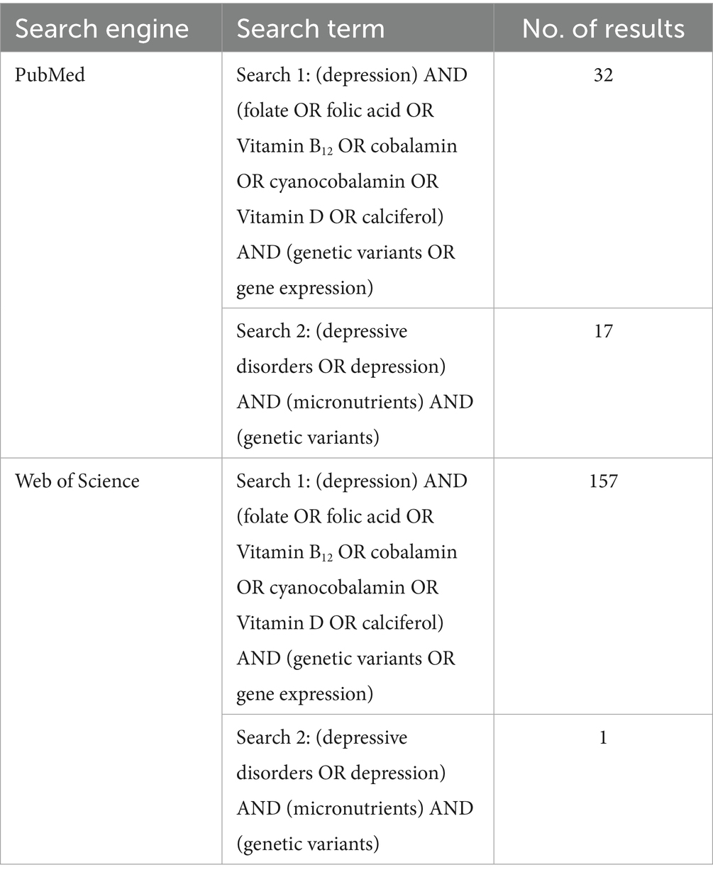 Studies were assessed if they (1) included VD, VB9, or VB12-associated genetic variants involved in vitamin metabolism and (2) had individuals who were depressed or had depressive symptoms. Table 2 details the full inclusion and exclusion criteria. Only original, peer-reviewed studies were considered.