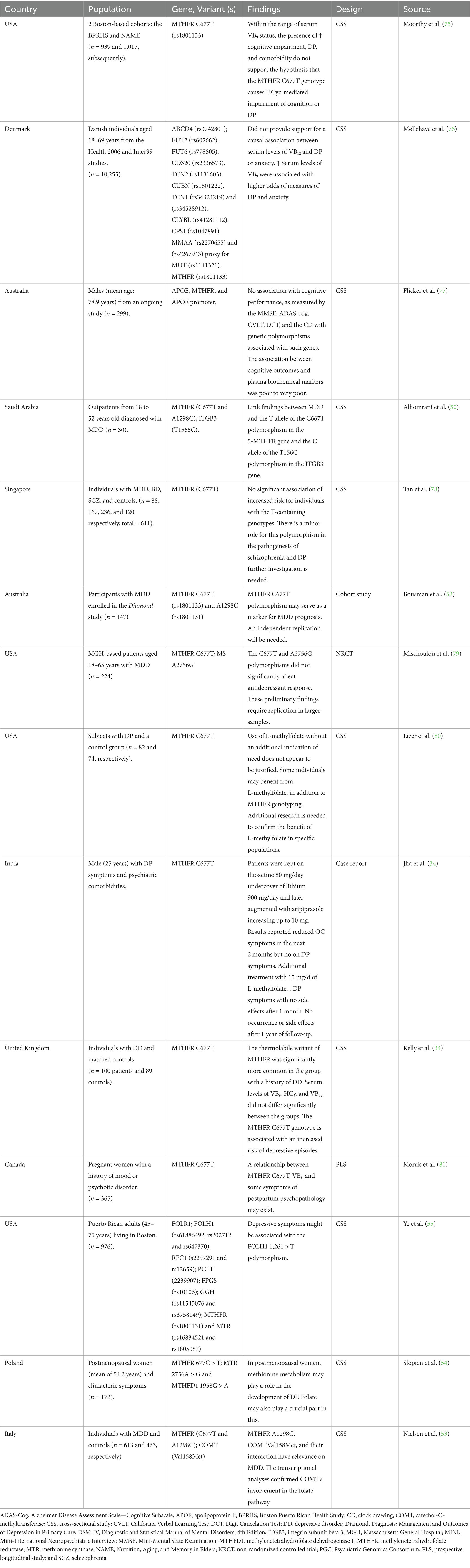 Conclusion: This systematic review emphasizes the role of vitamins B9, B12, and D and genetic variants associated with the development of depression. Regardless of the encouraging findings that supplementation with vitamins B9, B12, and D could support depressive symptomatology, additional research is needed to propose therapeutic guidelines. Personalized strategies considering dietary, genetic and environmental factors could enhance treatment results for individuals with depression.
