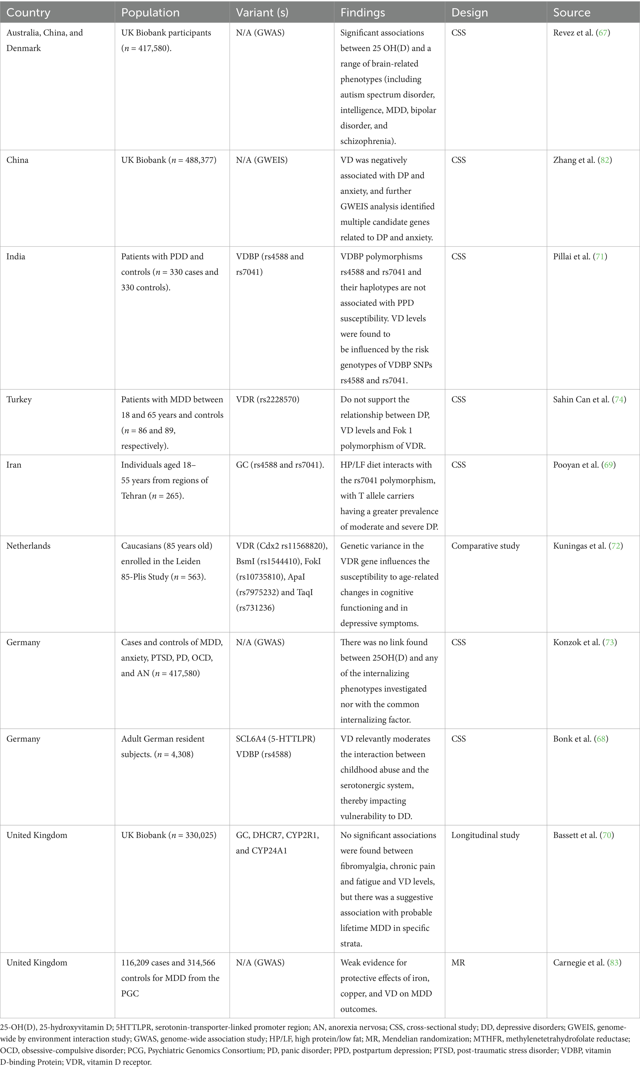 Recent studies have demonstrated a complex relationship between VD, genetic variants, and depression. One example includes research conducted by Zhang et al. who analyzed the UK Biobank and found a negative association between VD levels and depression and anxiety, in which significant associations between blood VD and psychiatric traits were found (66). Another study analyzing the UK Biobank conducted by Revez et al. found a significant association between 25 OH D levels and brain-related phenotypes that included MDD (67). Furthermore, low VD levels were linked to a higher probability of depression among populations, including carriers of 5-HTTP gene variants and individuals with a history of traumatic childhood events (68). Additionally, recent studies have examined the relationship between depression and genetic variations in the VD pathway. Vitamin D levels might be influenced by certain polymorphisms; some studies have associated this with GC and CYP2R1 genes (69, 70). The GC gene encodes for VD-binding protein, involved in the transportation of VD to various tissues (70). Similarly, the gene CYP2R1 encodes the VD 25-hydroxylase, the liver enzyme involved in the 25-hydroxylation of VD, a key regulator in the synthesis of 25 (OH)D (70). Pooyan et al. studied 265 individuals in Tehran using convenience sampling and found that a high-protein/low-protein diet interacts among carriers of the T allele in the rs7041 polymorphism, having a greater prevalence of moderate and severe depression symptomatology (69). In addition, this polymorphism was also studied in 330 PPD patients and controls; the findings were that rs4588 and rs704 are not associated with PPD in this population; however, they concluded that VD levels are influenced by polymorphisms in the vitamin D-binding protein (VDBP) (71). These genetic variants may have a significant influence on an individual’s metabolism of VD, resulting in a substantial effect on mental health outcomes. However, the small sample sizes and non-diverse populations in these studies make it difficult to examine how these factors may interact. Additionally, Kuningas et al. studied a cohort of 599 men aged 85 years and older from Leiden in the Netherlands and found that variants in vitamin D receptor (VDR) may have an impact on an individual’s cognitive ability as they age (72). In contrast, Konzok et al. and Sahin Can et al. studied different populations and did not find significant results linking VD levels or variants with depression (73, 74). Finally, more research needs to be performed regarding the genetic variants associated with VD biotransformation across different populations, using larger sample sizes and exploring a broader range of genetic variants.
