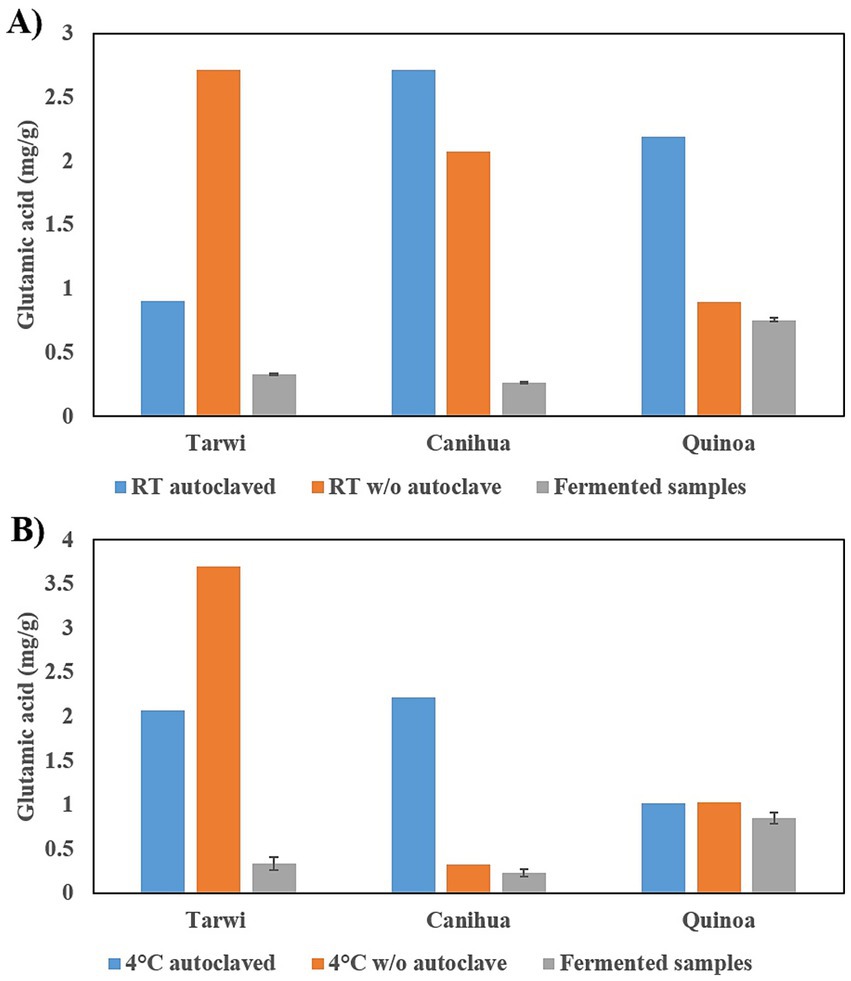 Tarwi samples behave differently from cañihua and quinoa when autoclaved (Figure 1). In tarwi seeds, a higher concentration of glutamic acid is observed when the samples are not autoclaved in both RT and 4 °C pretreatments: 2.71 mg/g and 3.69 mg/g, respectively, compared to the autoclaved control samples: 0.9 mg/g at RT and 2.07 mg/g at 4 °C. Indicating a loss of glutamic acid in the autoclaving process. However, cañihua and quinoa exhibit higher concentrations of free glutamic acid after autoclaving.