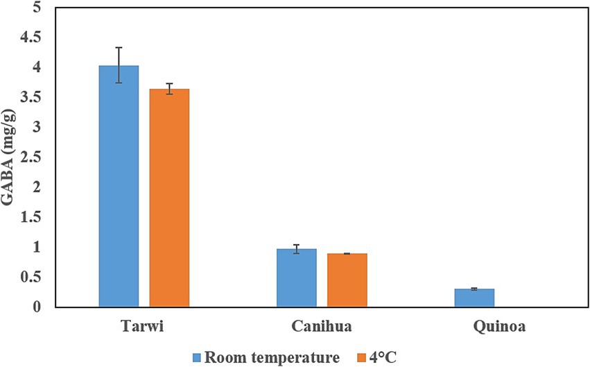 Figure 2. Production of GABA in three Andean seeds by fermentation with L. brevis. Two treatments, RT and 4 °C, were compared before the fermentation. Results from duplicates of fermentation.