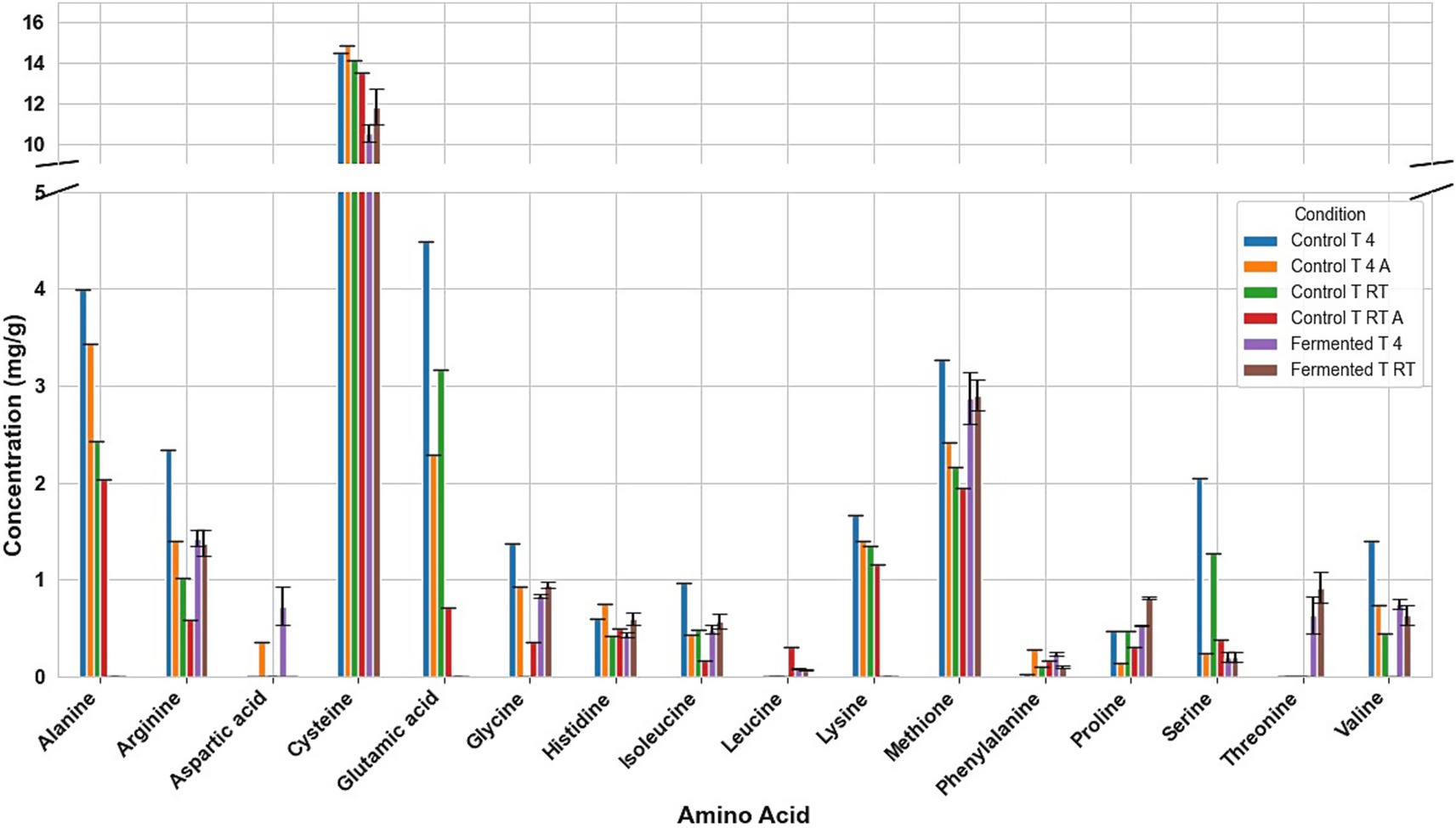 Figure 3. Amino acid profile of Tarwi samples. T RT A, room temperature pretreatment autoclaved; T RT, room temperature pretreatment w/o autoclaving; T 4 A, 4 °C pretreatment autoclaved; T 4, 4 °C pretreatment w/o autoclaving. Results from one replicate of controls and duplicates of fermentation samples, expressed as average ± standard deviation.