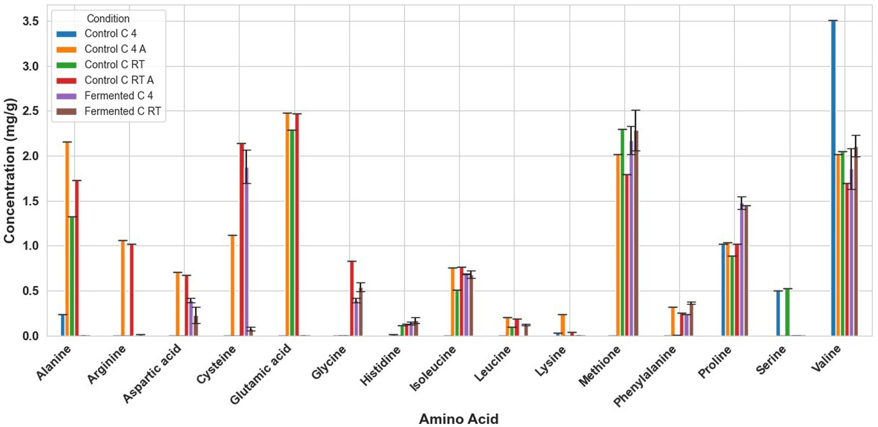 Figure 4. Amino acid profile of cañihua samples. C RT A, room temperature pretreatment autoclaved; C RT, room temperature pretreatment w/o autoclaving; C 4 A, 4 °C pretreatment autoclaved; C 4, 4 °C pretreatment w/o autoclaving. Results from one replicate of controls and duplicates of fermentation samples, expressed as average ± standard deviation.