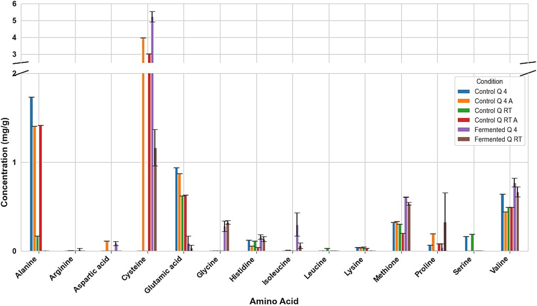 Figure 5. Amino acid profile of quinoa samples. Q RT A, room temperature pretreatment autoclaved; Q RT, room temperature pretreatment w/o autoclaving; Q 4 A, 4 °C pretreatment autoclaved; Q 4, 4 °C pretreatment w/o autoclaving. Results from one replicate of controls and duplicates of fermentation samples, expressed as average ± standard deviation.
